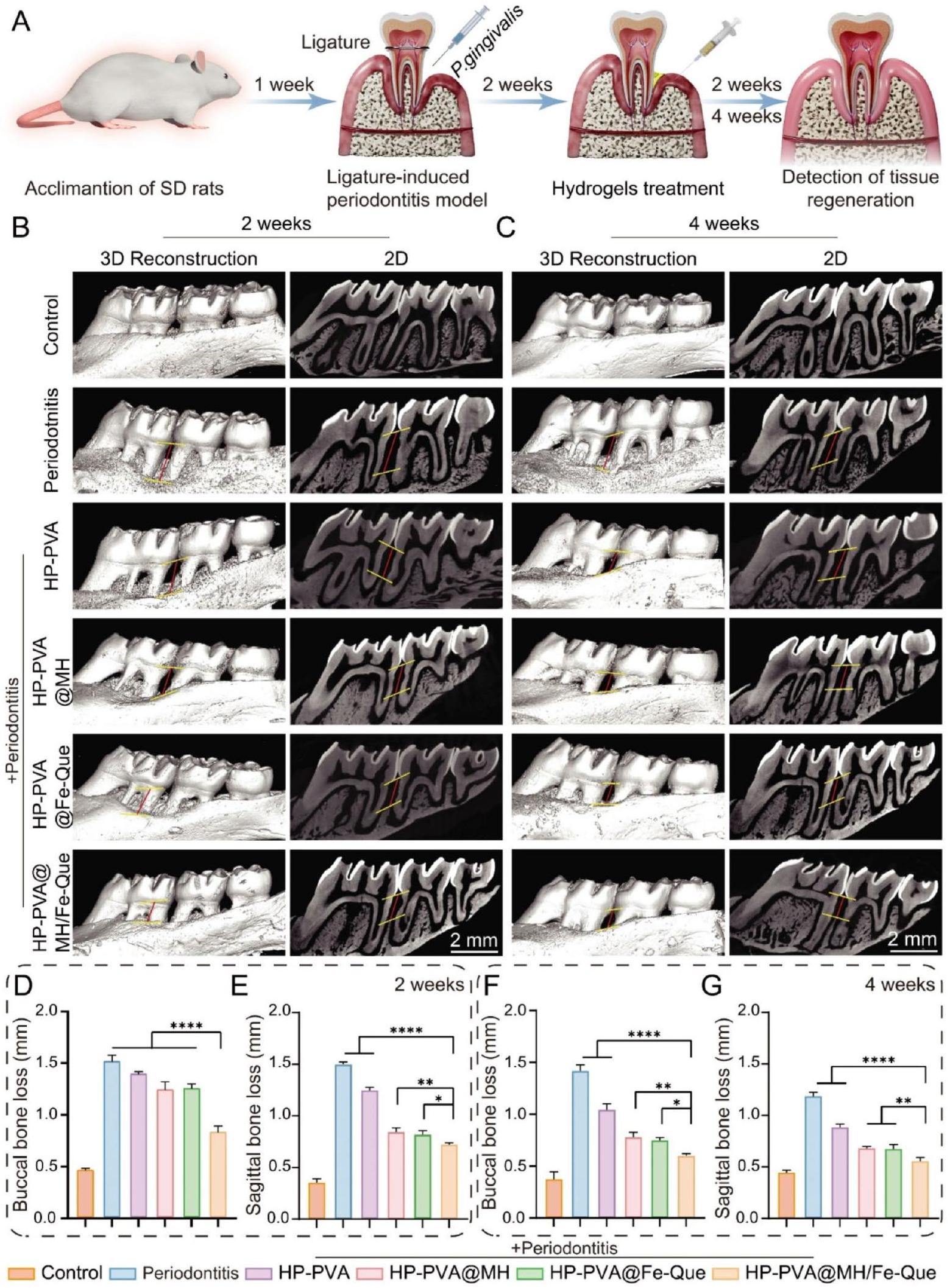 في 4 أسابيع، لاحظنا استعادة محدودة لفقدان العظم في مجموعة التهاب اللثة، مع هيكل نسيج ضام غير منظم (الشكل 10A، B). في مجموعة علاج HP-PVA، كان هناك استعادة طفيفة في النسيج الضام وارتفاع العظم السنخي، دون تأثير كبير على علاج التهاب اللثة. كان تسرب الخلايا الالتهابية أقل بكثير في مجموعة HP-PVA@Fe-Que و