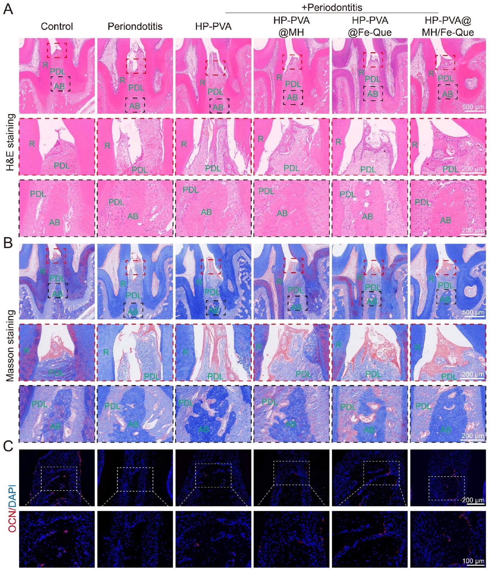 In 4 weeks, we observed limited bone loss recovery in the periodontitis group, with disordered connective tissue structure (Fig. 10A, B). In the HP-PVA treatment group, there was slight recovery of the connective tissue and alveolar bone height, with no significant effect on the treatment of periodontitis. The inflammatory cell infiltration was significantly less in the HP-PVA@Fe-Que and