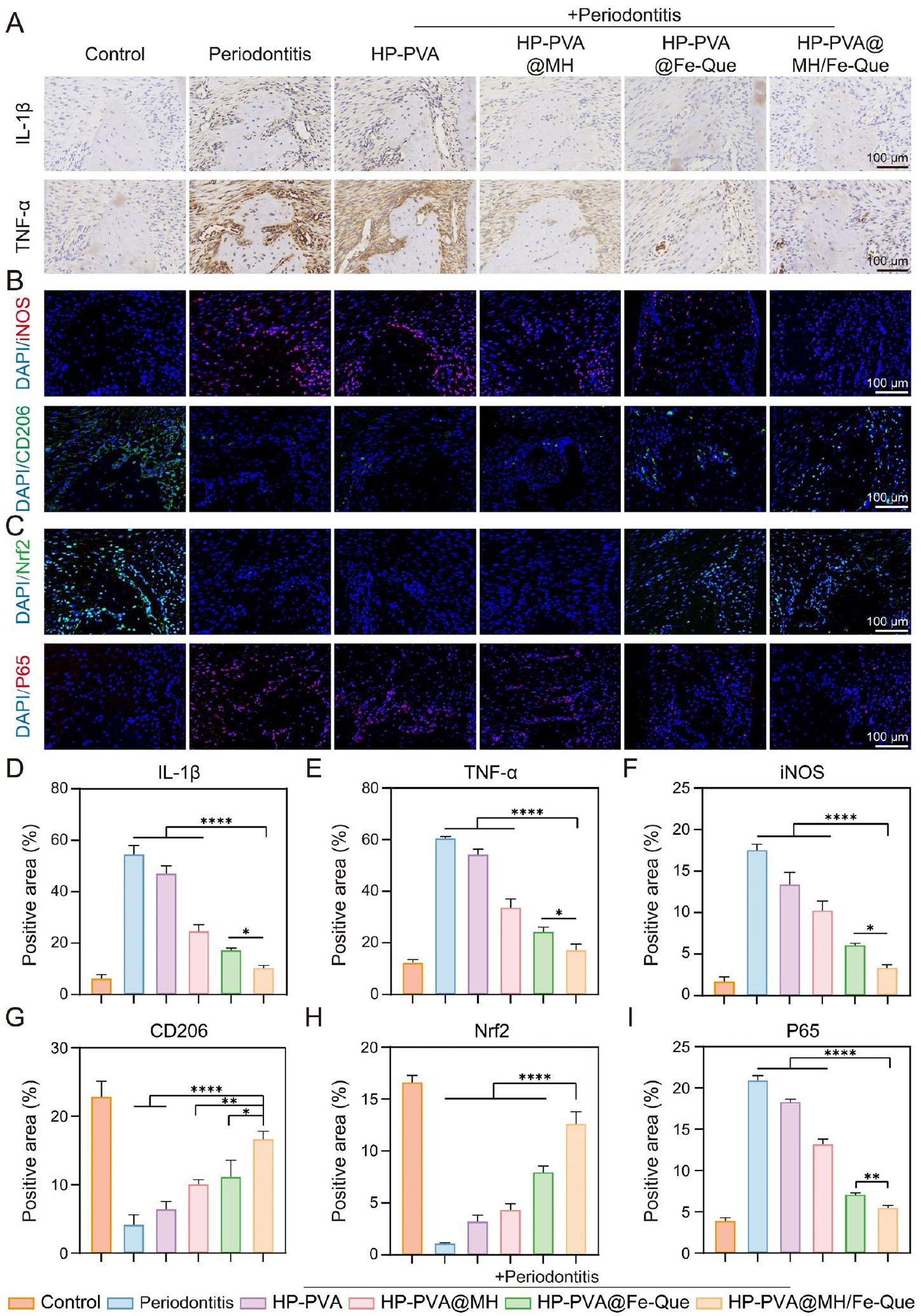 iNOS and CD206, respectively. Figure 11B showed that the fluorescence intensity of iNOS in the periodontitis group was the highest, indicating a significant increase in expression, while the expression of CD206 was lower. After treatment with HP-PVA@MH/Fe-Que hydrogel, the fluorescence intensity of M1 macrophages significantly decreased, while the fluorescence intensity of M2 macrophages significantly increased (Fig. 11F, G), indicating that the HP-PVA@MH/Fe-Que group can inhibit the polarization of M1 macrophages and promote the polarization of M2 macrophages, and with good immune modulating function.