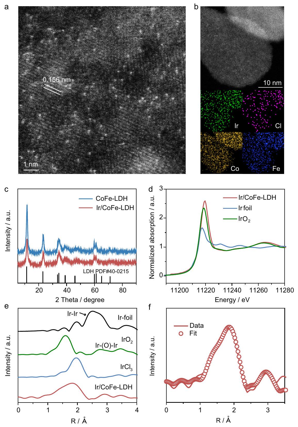 Iridium-based catalyst has been widely used in catalyzing water electrolysis and chloralkaline process , in which the Ir-chloride bond strength determines its selectivity . LDH elemental combinations with lower electronegativity may exhibit enhanced electron coupling with metal single atoms . Based on electronegativity values ( ), it is anticipated that noble metal single atoms on CoFe LDHs may demonstrate superior OER performance. In this work, we develop a two-step synthesis to prepare single Ir atom catalysts with tunable single atomic Ir coordination structure on layered double hydroxide (LDH), as shown in Supplementary Fig. 1. In the first step, was synthesized through a co-precipitation method. Subsequently, dilute solutions of and NaOH were added to the homogeneous LDH colloid to anchor atomic Ir onto CoFe-LDH as well as tune the chloride bonding on the single atomic Ir sites. SEM images reveal that both CoFe-LDH and Ir/CoFe-LDH exhibit uniform nanosheet structures, with no noticeable changes in surface morphology upon Ir loading (Supplementary Fig. 2). The Ir in the asprepared catalyst was determined to be by inductively coupled plasma mass spectrometry (ICP-MS). Transmission electron microscopy (TEM) characterization shows clean surface of without formation of nanoparticles/nanoclusters (Supplementary Fig. 3). The high angle annular dark field scanning transmission electron microscope (HADDF-STEM) images clearly show bright spots, which can be assigned to single Ir atoms anchored on the surface of CoFe-LDH (Fig. 1a). Meanwhile, Ir atoms still show isolated bright spots at the same position in the HAADF-STEM images with a tilt (Supplementary Fig. 4), confirming single atomic dispersion of Ir. There seems to be a cluster in the yellow circle in Supplementary Fig. 5a and in the red circle in Supplementary Fig. 5b, however, they both display single atoms at other viewing angles, indicating that the “agglomeration” of Ir single atoms may just be caused by viewing angles. Dr. probe STEM simulation software was used to fit the HAADF-STEM image of Ir/CoFe-LDH, which also suggests single atomic dispersion of Ir with different brightness (Supplementary Figs. 6 and 7). The elemental mapping (Fig. 1b) analysis shows homogeneous distribution of Ir along with Cl on the surface of . Furthermore, X-ray diffraction (XRD) patterns of the as-prepared CoFe-LDH and Ir/CoFe-LDH display the same Bragg reflections in good agreement with the hexagonal-phase LDH (black line, PDF#40-0215, as shown in Fig. 1c), in accordance with the selected area electron diffraction (SAED) patterns (Supplementary Fig. 8).