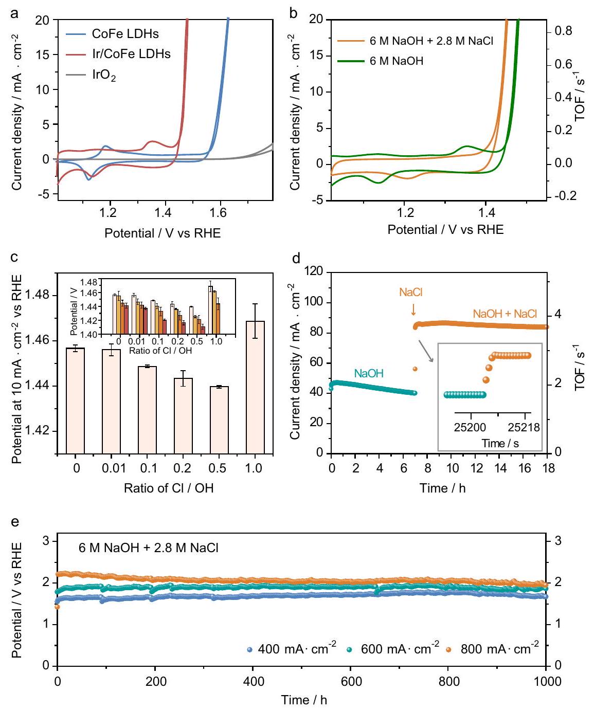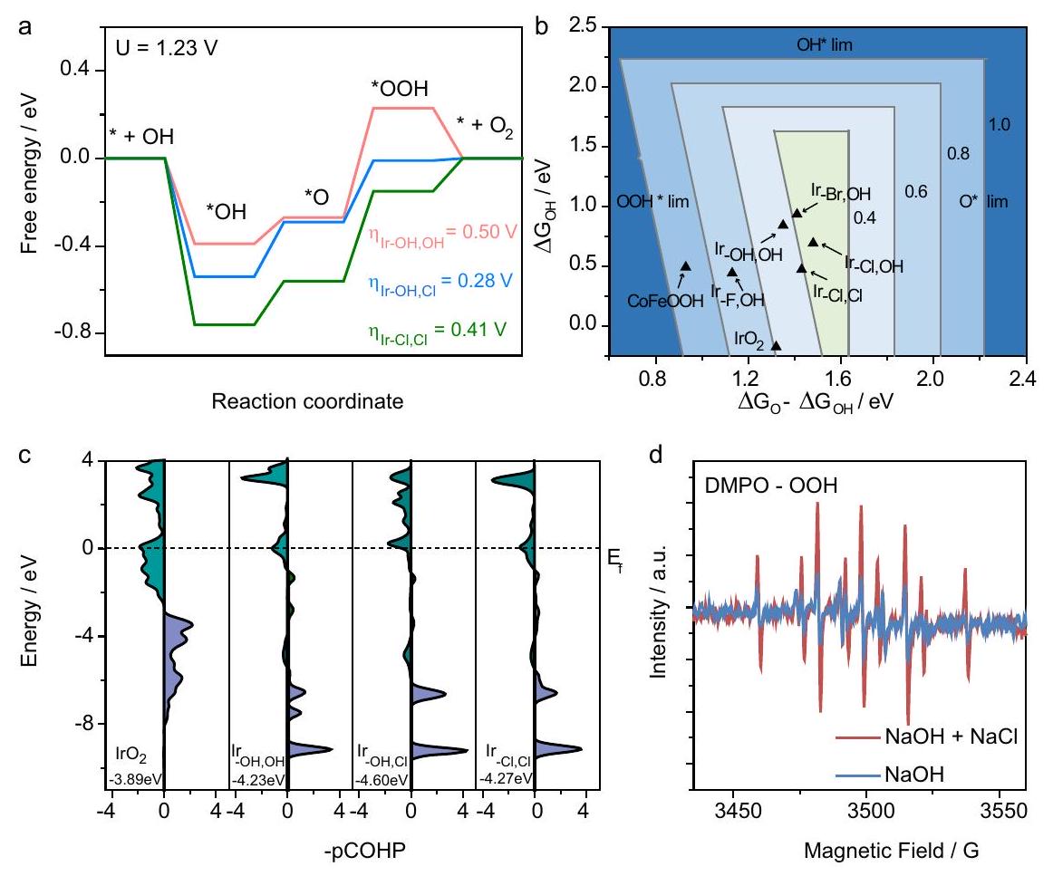 مركز نشط. نتيجة لذلك،يظهر أداءً ملحوظًا في تفاعل الأكسدة الكهربائية في مياه البحر القلوية مع جهد زائد منخفض يصل إلى 202 مللي فولت عند كثافة تيارأقل من ذلك في إلكتروليت NaOH. علاوة على ذلك،يوفر نشاطًا ملحوظًا عند كثافات تيار ذات صلة بالصناعة ) مع قرب من كفاءة فارداي للأكسجين لأكثر من 1000 ساعة. في الوقت نفسه، يمكن أن تعمل أيضًا بشكل مستقر في مياه البحر الحقيقية، مما يصل إلىمع جهد زائد قدره 208 مللي فولت، ويحافظ على تشغيل مستقر لأكثر من 2000 ساعة عند كثافة تيارتظهر كل من التجارب في الموقع والتحليلات النظرية أن امتصاص أيونات الكلوريد الديناميكي على ذرة إيريديوم واحدة أثناء عملية أكسدة الماء يمكن أن يقلل بشكل فعال من حاجز الطاقة لتكوين *OOH (الخطوة المحددة للسرعة في أكسدة الماء) وبالتالي يعزز تحفيز أكسدة الماء، بينما في نفس الوقت يحافظ على حاجز طاقة مرتفع لتفاعل الكلوريد.