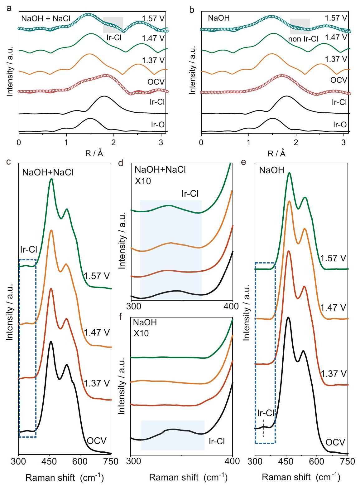 علاوة على ذلك، في بيئة (الشكل 3c، d)، تم ملاحظة وجود تنسيق Ir-Cl عند بشكل متسق. في المقابل، في الإلكتروليتات القلوية بدون إضافة Cl، تم ملاحظة تنسيق فقط تحت حالة جهد الدائرة المفتوحة (OCV)، وتوقف وجوده عند تطبيق الجهد (الشكل 3e، f)، مما يشير إلى طبيعته الديناميكية. تشير هذه الظاهرة إلى أنه تحت تركيز عالٍ من ، هناك تنافس ملحوظ على الامتصاص بين و ، مما يتطلب تركيزًا عاليًا من NaCl للحفاظ على استقرار التنسيق. تتماشى هذه الملاحظة مع بيانات XAS لدينا، حيث يبقى التنسيق بين Ir وCl سليمًا في بيئة عالية التركيز من الملح، بينما يتبدد في بيئة غنية بـ . وبالتالي، يصبح من الضروري الحفاظ على بيئة ذات تركيز ملح مرتفع نسبيًا للحفاظ على تنسيق ، مما يسهل حركية OER.