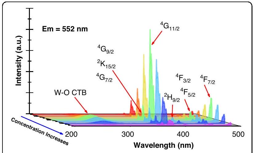 لفحص امتصاص الطول الموجي القصير لـفيالفوسفورات، طيف الإثارة للعناصر مع اختلافتم قياس التركيزات من خلال مراقبة انبعاث 552 نانومتر الذي يتوافق معالانتقال ويظهر في الشكل 1. يُرى