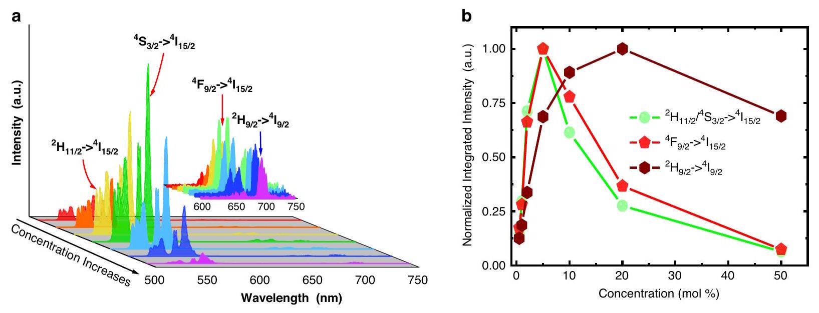 يظهر طيف انبعاث التحويل العلوي في نطاق الطول الموجي من 400 نانومتر إلى 1100 نانومتر للعينات المختلفة التركيز، ويظهر الإدراج طيف الانبعاث المعزز المكبر في نطاق الطول الموجي من 400 نانومتر إلى 900 نانومتر. يمكن ملاحظة أنه تحت تحفيز 1550 نانومتر مُشَبَّع أحاديالفوسفورات تصدر بشكل رئيسي ضوء الأشعة تحت الحمراء بطول موجي 999 نانومترانتقال، والانبعاثات الأخرى الناتجة عن التحويل العلوي التي تتوافق و ضعيفة للغاية. تظهر المربعات الصلبة الموزعة في الشكل 5a اعتماد شدة التحويل الصاعد عند 999 نانومتر علىتركيز المنشطات. وُجد أن شدة انبعاث التحويل العلوي تزداد بشكل أحادي ولكن معدل نموها يتناقص مع الزيادة التركيز. كحل وسط بين القطع الكمي والتحويل العلوي، اختيار التركيز لـمن المعقول أيضًا تقديمتظهر الشكل S8 طيف انبعاث التحويل العلوي للعينات المضافة إليها بتركيز ثابتومتنوع التركيزات ( ، و يمكن ملاحظة أن الانبعاث بالأشعة تحت الحمراء يكاد يكون نقيًا منتمت ملاحظة انبعاث عند 999 نانومتر مصحوب بانبعاثات مرئية ضعيفة جداً، وتزداد شدة الانبعاث تحت الأحمر مع الزيادة. التركيز. إدراج الشكل S8 يظهر الطيف المكبر الذي يتراوح من 400 نانومتر إلى 900 نانومتر. الشكل 5ب يظهر اعتماد شدة الانبعاث تحت الأحمر المتكاملة على التركيز. من الشكل 5ب يمكن ملاحظة أن المقدمة تزيد بشكل كبير من انبعاث الأشعة تحت الحمراء، وشدة تحويل الأشعة تحت الحمراءشدة الفوسفور المشترك أعلى بـ 20 مرة من شدةفوسفور مفرد التخصيب. إن تراجع التركيز لعملية التحويل الصاعد يختلف عن عملية التحويل الهابط حيث إن تراجع التركيز يعتمد على طول موجة الإثارة. تؤدي أطوال الموجات المختلفة للإثارة إلى مسارات مختلفة للتعبئة والتفريغ.