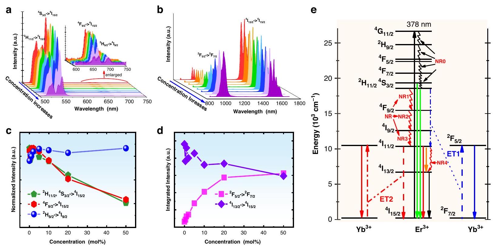 يجب الإشارة إلى أنه إذا لم يكن ET2 موجودًا، فإن شدةالانتقال سيزداد متبعًا نفس الاتجاه كماشدة الانبعاثات تفعل ذلك. وذلك لأنيتم تعبئته من خلال كل من الانتقال الإشعاعيوالاسترخاء غير الإشعاعي من، و الـ يتم تعبئته عبر نقل الطاقة ET1 الذي يثير زيادةشدة الانبعاثات مع الزيادة التركيز. يجب أيضًا ملاحظة أنه إذا كانت نسبة السكان المكتسب من خلال عملية ET1 يُساهم بالكامل فيعبر عملية ET2، ثم مع زيادةتركيز شدةالانتقال سيحافظ على كثافة ثابتة كما فيعينة ذات شائبة واحدة. إذا كانت نسبةالمكتسب من عملية ET1 يساهم جزئيًا فيعبر عملية ET2 وساهم جزئيًا فيعبر الانتقال الإشعاعي والاسترخاء غير الإشعاعي منثم انبعاث الأشعة تحت الحمراء لـسوف تُظهر الانتقال أيضًا اتجاهًا متزايدًا عندمايزداد التركيز. انخفاض شدة انبعاث الأشعة تحت الحمراءالانتقال مع زيادةتشير التركيز إلى تحسين كبير في معدل نقل الطاقة لعملية ET2 مع الزيادةتركيز. استنادًا إلى التحليلات المذكورة أعلاه، يتم توضيح طرق تقسيم الفوتونات المحددة في الشكل 3e. في الخطوة الأولى،في الحالة الأساسيةيتم ترقية إلى الحالة المثيرةعن طريق امتصاص فوتون بطول موجي 378 نانومتر، ثم تسترخي بسرعة إلى الدول. الـ فييمكن أن يتم تقليل إثارة الحالات عبر ثلاثة مسارات ممكنة، وهي الانتقال الإشعاعيالاسترخاء غير الإشعاعي منإلى، ونقل الطاقة ET1تولد الانتقالات الإشعاعية الانبعاثات الخضراء كما هو موضح في الشكل 1a، وتؤدي الاسترخاءات غير الإشعاعية إلى تكوينويزيد أيضًا من انبعاث الضوء الأحمر الضعيف جدًا كما هو موضح في الإضافة في الشكل 1a. عملية ET1 يمكن أن يحدث في الوقت نفسه تأثيران من انبعاث الأشعة تحت الحمراءوسكانمن. الـفييمكن أن يتم تخفيض طاقته عبر الانتقالات الإشعاعية و الاسترخاء غير الإشعاعي إلى، وانتقال الطاقة ET2. الانتقال الإشعاعييمكن أن يولد فوتونات بطول موجي 980 نانومتر. الانتقال الإشعاعيوالاسترخاء غير الإشعاعي منإلىسوف ينتج عنه انبعاث بطول موجي 1550 نانومتر. عملية ET2 تولد انبعاثات تحت الحمراء من.