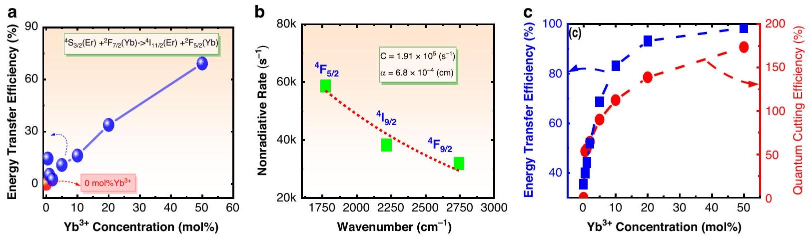 المستويات التي تقع بين و لن يحدث ذلك لأن هذه المستويات لم تُعمر بشكل فعال. من الشكل 3أ، يمكن ملاحظة أن العينات ذات المتغيراتتظهر التركيزات أربعة انبعاثات كما لوحظ فيعينات ذات شائبة واحدة. توضح الأشكال 3c و 3d اعتماديات كثافات الانبعاث الثلاثة المرئية وكثافتين من الانبعاث في نطاق الأشعة تحت الحمراء القريبة على التركيز، على التوالي. وقد وُجد أنه على الرغم من تركيز ثابت، شدة الانبعاث لـيقل مع زيادة التركيز. هذه الحقيقة تعني أن يلعب دورًا في تقليل السكانالمستويات، أي نقل الطاقة منإلى يحدث. استنادًا إلى قاعدة مطابقة الطاقة، يمكن تأكيد مسار نقل الطاقة على أنه ET1: الفجوة الكبيرة في الطاقة بين فرق الطاقة منإلىوفارق الطاقة منإلىيعني أن نقل الطاقة المدعوم بالفونونات متضمن، وأن ET1 يحدث من خلال إلغاء الفونونات الشبكية للحفاظ على حفظ الطاقة. بعد هذا النقل للطاقة،يدخل فيو واحديدخل فيبالمثل، من اعتماد شدة انبعاث الضوء الأحمر علىتركيز، نقل طاقةيمكن استنتاج ذلك، وعملية نقل الطاقة هذه غير موضحة في الشكل 3e لأن مساهمتها في القطع الكمي ضئيلة جداً بسبب عدد السكان القابل للتجاهل.منتحت إثارة 378 نانومتر. من