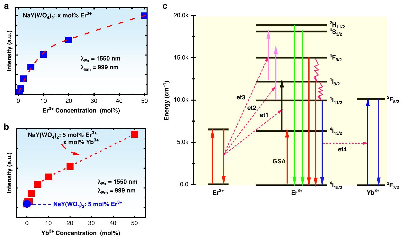 من طيف التحويل العلوي وشدة التحويل العلوي المعتمدة على قوة الإثارة، الآليات المحتملة للتحويل العلوي لـ و مخدرتُصوَّر الفوسفورات في الشكل 5c.مُشَبَّع أحاديالفوسفورات تحت تحفيز 1550 نانومتريمكن أن يتم تعبئته من خلال امتصاص الحالة الأرضية. الـيتم بشكل رئيسي تعبئته عبر نقل الطاقة et1 منذ امتصاص الحالة المثارةضعيف إلى حد ما بسبب الفجوة الكبيرة في الطاقة ومعدل الانتقال المنخفض لـ (انظر الجدول 1). يتم تقليل عدد السكان بشكل رئيسي من خلال استرخاء غير إشعاعي إلى لذلك الشديديمكن ملاحظة انبعاث التحويل العلوي فيعينات ذات شائبة واحدة.يتم توطينها بشكل رئيسي من خلال نقل الطاقة et2، ولكن معدل نقل الطاقة ضعيف نسبيًا بسبب الحجم الكبير عدم تطابق الطاقة على الرغم منمكتظ بالسكان من خلال استرخاء غير إشعاعي منإلى. لذلك، فإن انبعاث التحويل الأحمر ضعيف. يتم تعبئته من خلال نقل الطاقة et3، ولكن عدد السكان لـ أقل بسبب الانتقال غير الإشعاعي القوي. لذلك، فإن الانبعاثات الخضراء من أيضًا ضعيفة.
