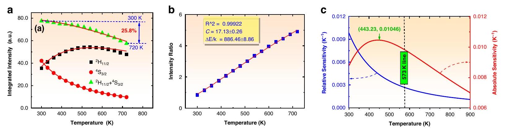 تم اختيارها للدراسة وتم قياس طيف الانبعاث الأخضر عند درجات حرارة مختلفة من 300 كلفن إلى 720 كلفن تحت تحفيز 378 نانومتر، كما هو موضح في الشكل S11. تم قياس شدة الانبعاث المتكاملة لـ و تم حساب الانتقالات. تظهر المربعات الصلبة، والدوائر الصلبة، والمثلثات في الشكل 6a شدة الفلورسنت المعتمدة على درجة الحرارة لـ و الانتقالات ومجموعها. يمكن ملاحظة أنتتناقص كثافة الانبعاث بشكل أحادي مع زيادة درجة حرارة العينة، ويمكن أن يُعزى هذا الانخفاض إلى معدلي إزالة السكان المعززين، وهما معدل الاسترخاء غير الإشعاعي إلىومعدل السكان الحراري إلى. الـتزداد كثافة الانبعاثات أولاً ثم تنخفض مع زيادة درجة الحرارة، وذلك بسبب عمليتين متنافستين من التزايد والتناقص السكاني. عملية التزايد هي الإثارة الحرارية لـ مما يؤدي إلى تعزيز كثافة الانبعاثات، وعملية انخفاض السكان هي انخفاض إجمالي عدد السكان لـ و بسبب الاسترخاء غير الإشعاعي لـ مما يؤدي إلى تقليل كثافة الانبعاث. من الشكل 6a يمكن ملاحظة أن الفوسفورات المدروسة تظهر تراجعًا ممتازًا في درجة الحرارة حيث أن مجموع كثافتي الانبعاث الأخضرتين يظهر انخفاضًا قدره فقط عندما ترتفع درجة الحرارة من 300 كلفن إلى 720 كلفن. إن أداء التبريد الممتاز لدرجات الحرارة للفوسفورات المدروسة يفيد في تطبيقها في خلايا الشمسية حيث تعمل خلايا الشمسية غالبًا في درجات حرارة مرتفعة. المربعات الصلبة في الشكل 6ب تظهر نسبة شدة الفلورسنت لـالانتقال إلى الانتقال. تم ملاءمة البيانات في الشكل 6ب للصيغة التالية