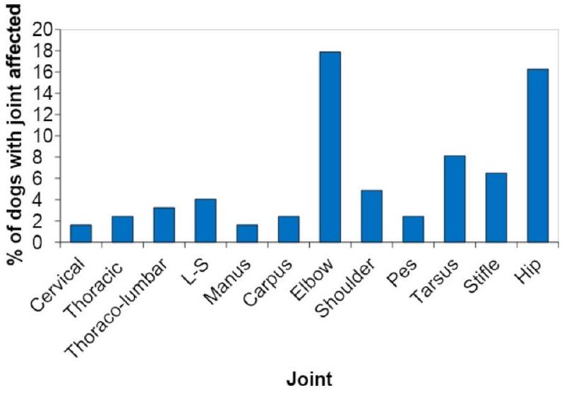 Our data indicate a high prevalence of rOA in young dogs, and particularly in the elbow and hip, supporting the assertion that OA is primarily driven by developmental disease in dogs. However, we did not review medical records to ascertain whether the affected joints had been diagnosed with developmental joint disease. In our study, the most commonly affected joints were elbow, hip, tarsus, and stifle. This is similar to previous findings in older dogs except for the tarsus . It is unclear why the tarsus was not identified as a site of OA in Johnson’s study, but the population they evaluated was selected from cases sent to a teaching hospital, which might have had some selection bias.