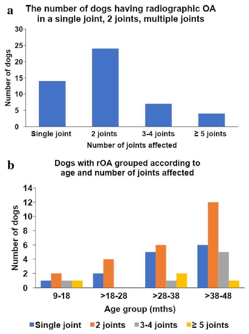 المفاصل المتأثرة شعاعياً بالترتيب التنازلي للتكرار كانت الكوع، الورك، الكاحل، والركبة (الشكل 2). بالإضافة إلى ذلك، يوضح الجدول 2 والشكل 3a عدد المفاصل الطرفية الفردية المتأثرة: تم العثور على التهاب المفاصل التنكسي في مفصل واحد في 14 كلباً؛ ومفصلين في 24 كلباً؛المفاصل في 7 كلاب؛المفاصل في 4 كلاب. الشكل 3ب يوضح انتشار الكلاب في كل فئة عمرية مع أعداد متفاوتة من المفاصل المتأثرة بالتهاب المفاصل.