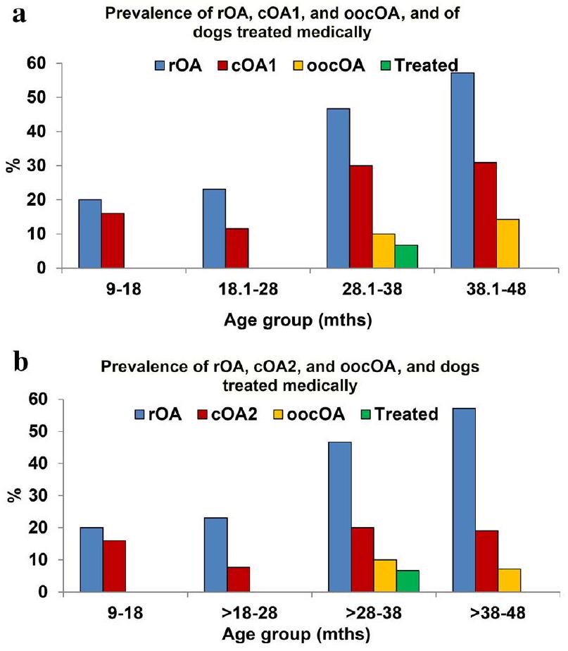 استنادًا إلى درجات مالكي الكلاب في دراسة التهاب المفاصل العظمي في الكلاب (LOAD)، لاحظ مالكو الكلاب المصابة بالتهاب المفاصل المزمن علامات على وجود ضعف فيلـ cOA1، ولـ cOA2، ولكن فقط 2 منهم (أو 2/6) تم علاجهم طبيًا من التهاب المفاصل التنكسي عند وقت تقييم الفحص الصحي (المعروف باسم ‘التهاب المفاصل التنكسي الملاحظ من قبل المالك، oocOA). يتم عرض انتشار rOA و cOA1 و cOA2 و oocOA في كل فئة عمرية في الجداول 3 و 4، ورسمياً في الشكل 4a و 4b.