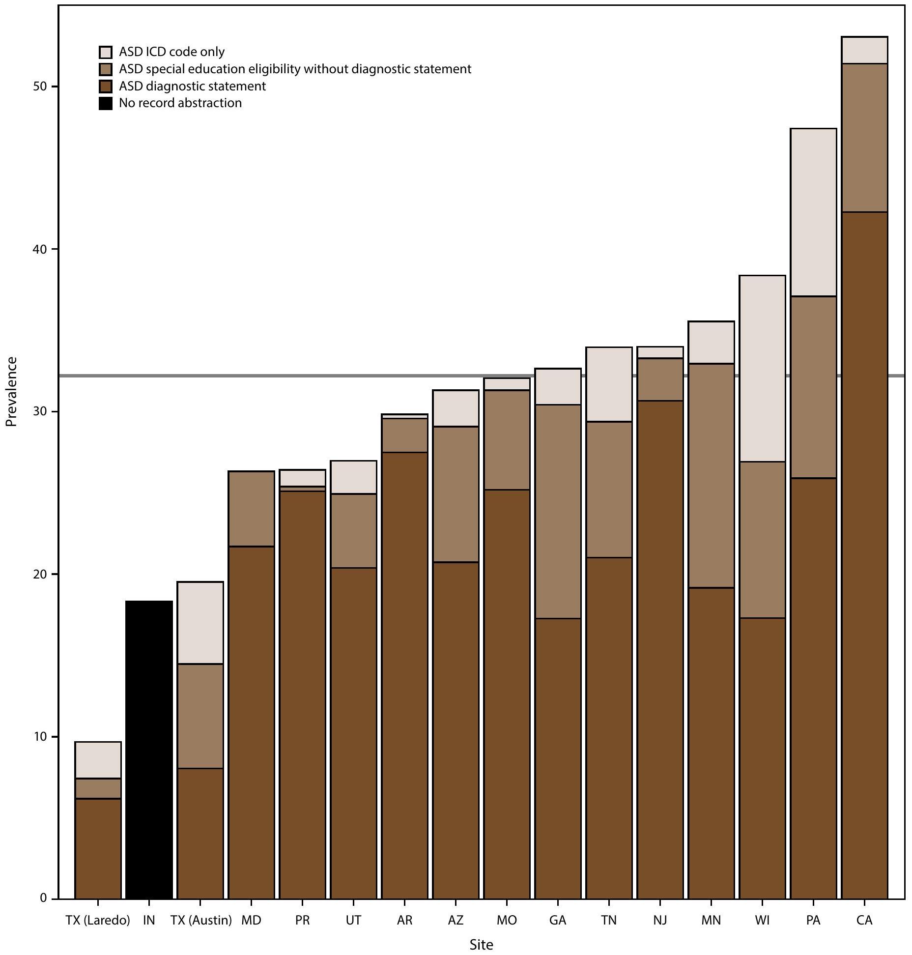 Horizontal line is the overall Autism and Developmental Disabilities Monitoring Network prevalence of 32.2 per 1,000 children aged 8 years. Children with documented ASD statements could also have ASD eligibility in special education or ASD ICD codes. Underlying data are available (Supplementary Table 6, https://stacks.cdc.gov/ view/cdc/177099#tabs-3).