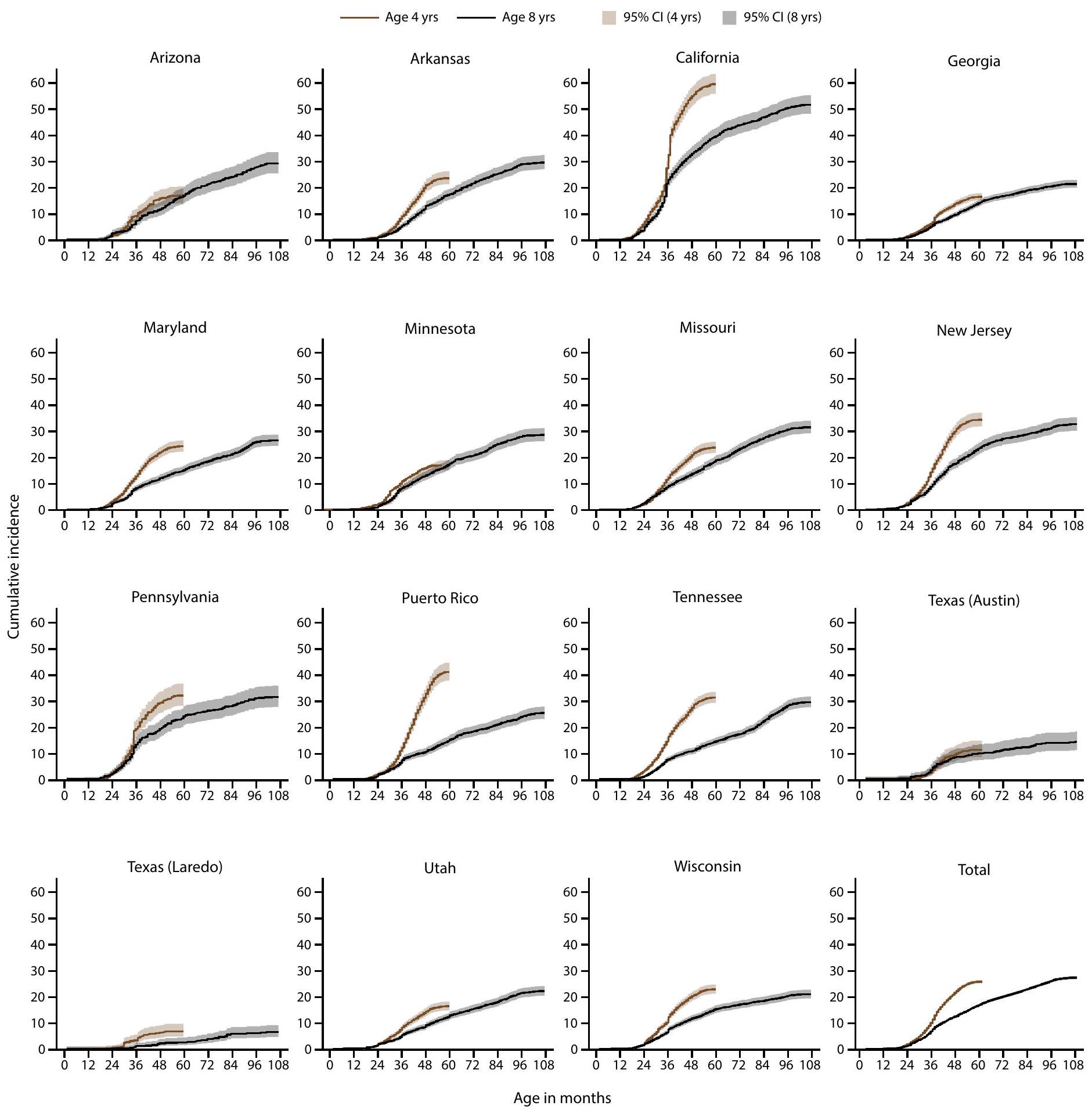 Data comparing cumulative incidence of autism spectrum disorder diagnosis or autism special education eligibility by age 48 months among children aged 4 or 8 years are available (Supplementary Table 10, https://stacks.cdc.gov/view/cdc/177099#tabs-3).