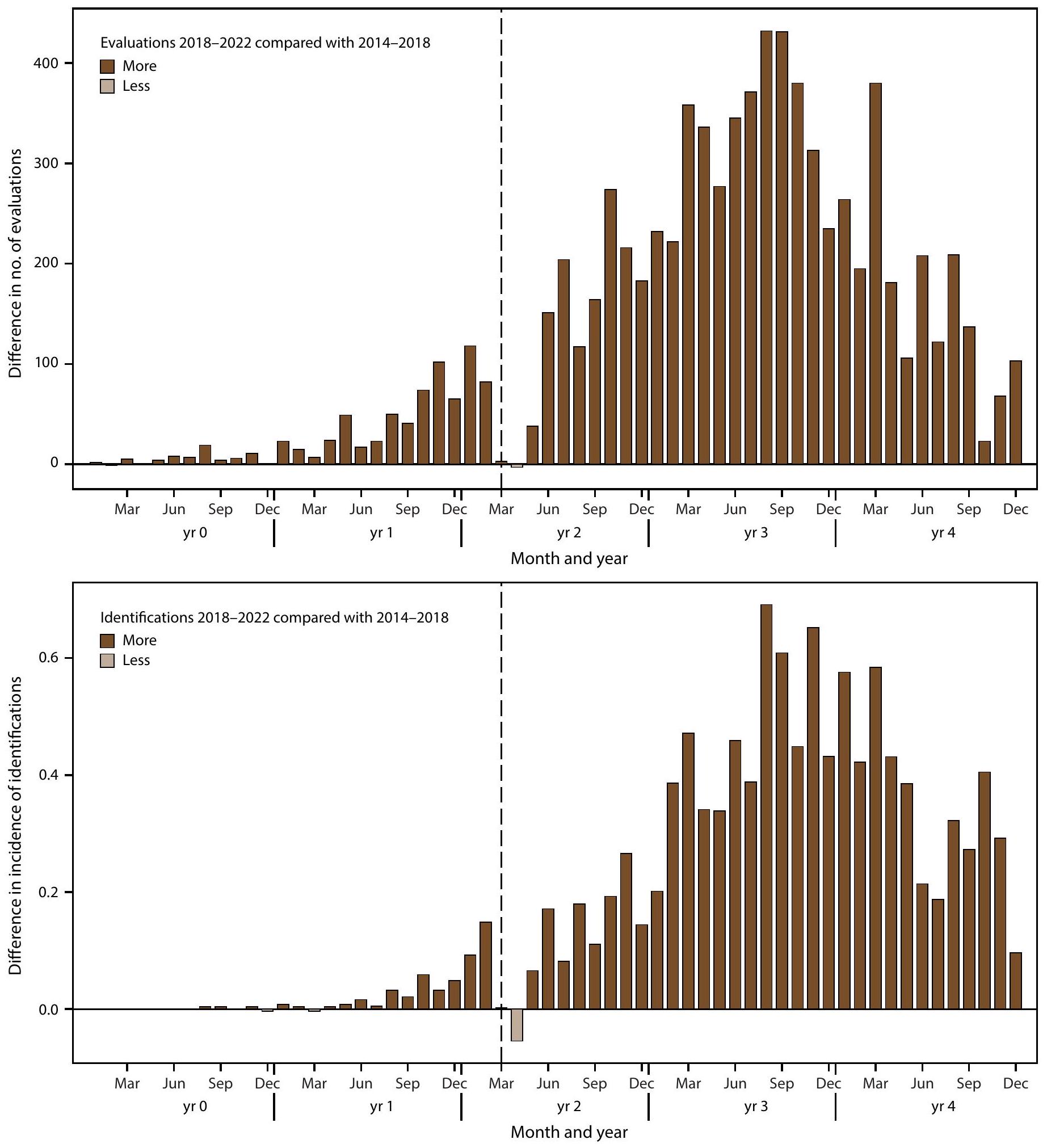 كانت نسبة الإصابة التراكمية بتشخيص اضطراب طيف التوحد أو الأهلية بحلول سن 48 شهرًا أعلى بين الأطفال المولودين في عام 2018 (الذين تبلغ أعمارهم 4 سنوات في عام 2022) مقارنة بالأطفال المولودين في عام 2014 (الذين تبلغ أعمارهم 8 سنوات في عام 2022) في 13 من أصل 15 موقعًا كانت قادرة على استخراج السجلات. كانت نسبة الإصابة التراكمية العامة بتشخيص اضطراب طيف التوحد أو الأهلية بحلول سن 48 شهرًا أعلى بمقدار 1.7 مرة بين المولودين في عام 2018 مقارنة بالمولودين في عام 2014، وتراوحت من 1.4 مرة أعلى في أريزونا وجورجيا إلى 3.1 مرة أعلى في بورتو ريكو. بين الأطفال الذين تبلغ أعمارهم 4 سنوات، كان هناك طفل واحد يفي بتعريف حالة اضطراب طيف التوحد من بين كل 10 أطفال.