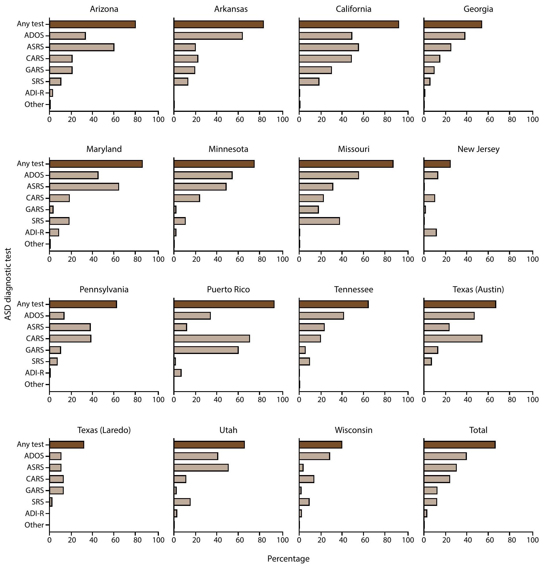 - Abbreviations: ADI-R = Autism Diagnostic Interview-Revised; ADOS = Autism Diagnostic Observation Schedule; ASD = autism spectrum disorder; ASRS = Autism Spectrum Rating Scales; CARS = Childhood Autism Rating Scale; GARS = Gilliam Autism Rating Scale; SRS = Social Responsiveness Scale; other test category includes Asperger Syndrome Diagnostic Scale, Gilliam Asperger’s Disorder Scale, and TELE-ASD-PEDS.