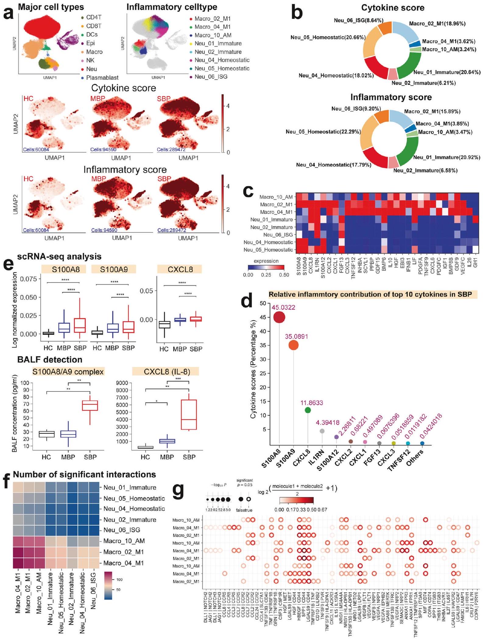 Fig. 2 Myeloid cells are the primary contributors to the production of pro-inflammatory cytokines in severe patients. a UMAP projections of BALFs. Colored based on the eight major cell types (top left), eight hyper-inflammatory cell subtypes (top right), cytokine score (Middle), and inflammatory score (Bottom). b Pie charts depicting the relative contribution of each inflammatory cell subtype to the cytokine and inflammatory scores in severe patients. c Heatmap depicting the expression of cytokines within each hyper-inflammatory cell subtype identified. d Lollipop chart depicting the relative contribution of the top ten cytokines in patients with severe disease. e Box plots of cytokine expression based on scRNA-seq and plasma profiling for healthy controls, mild patients, and severe patients. Significance was evaluated using the Kruskal-Wallis test with Bonferroni correction significance was evaluated using the Kruskal-Wallis test with Bonferroni correction (* ). f Heatmap plots of the sum of significant interaction among the eight hyperinflammatory cell subtypes. Dot plot of the interactions among inflammatory macrophages in severe patients. values are indicated by the circle sizes, as shown in the scale on the right