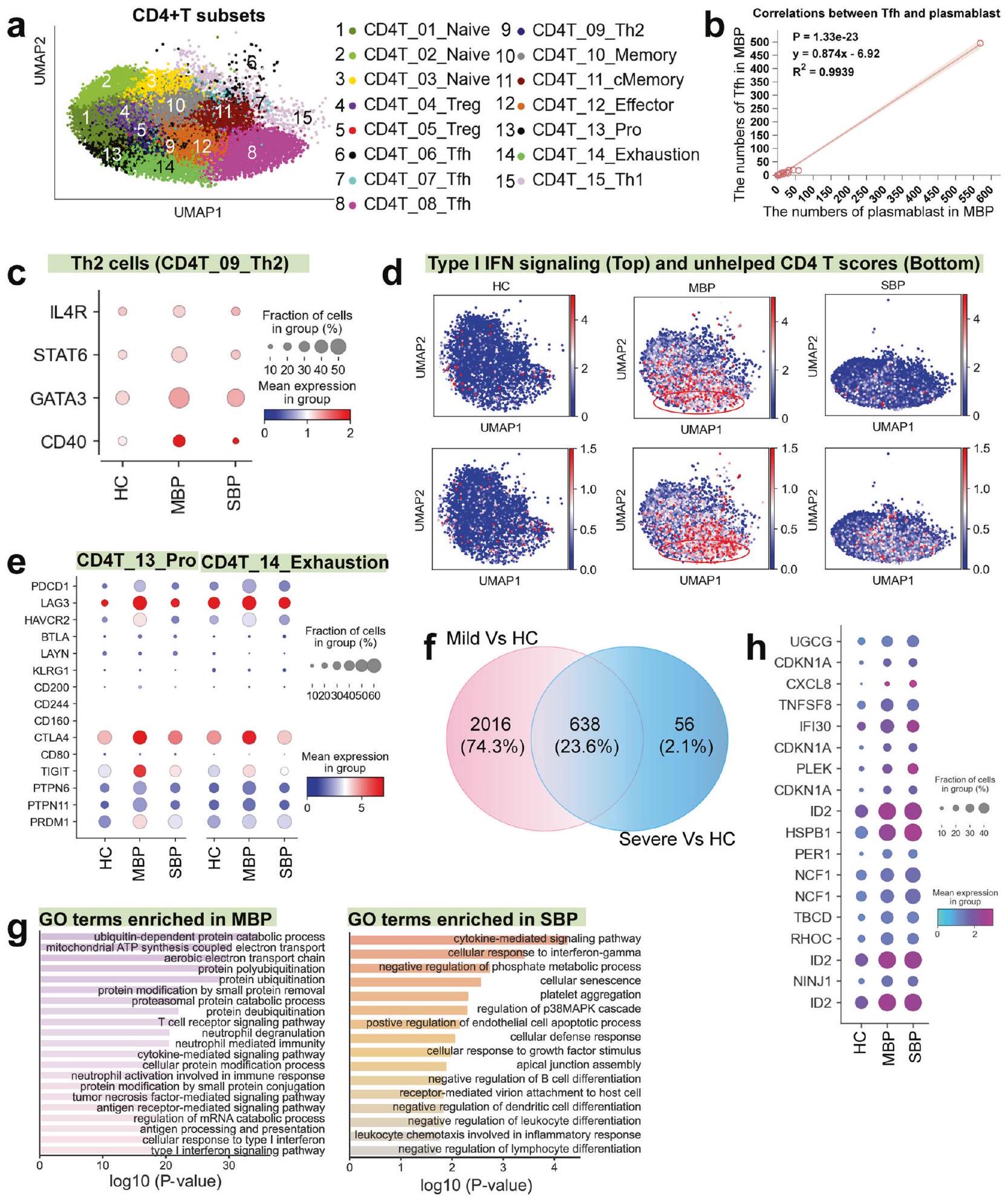 Fig. 3 Immunological features of CD4 T cell subsets. a The clustering result (Left row) of cell types (right row) from 74 samples. Each point represents one single cell, colored according to the CD4 T cell subtype. b Correlation between plasmablast with Tfh cells in mild patients. c Dot plots showing the expression of selected genes in Th2 cells across disease conditions. d UMAPs illustrating IFN-I response and unhelped signature scores for each CD4 T cell. The red circle highlights the CD4T_14_Exhaustion cluster, which is characterized by high expression of interferon-I (IFN-I) response genes and an unhelped T cell signature. e Flow cytometry plots showing gating strategy and typical exhausted molecules in CD8 T cells from bacterial pneumonia (Top row: severe bacterial pneumonia; Bottom row: mild bacterial pneumonia). f Dot plots showing the cell exhaustion-related markers in CD4_13_Pro and CD4T_14_Exhaustion across disease conditions. g Venn diagram illustrating the number of upregulated genes in cells. Enriched GO biological process terms for upregulated genes in cells from mild (Left) and severe (Right) disease. Only select terms are shown. i Dot plots showing cells related genes across disease conditions