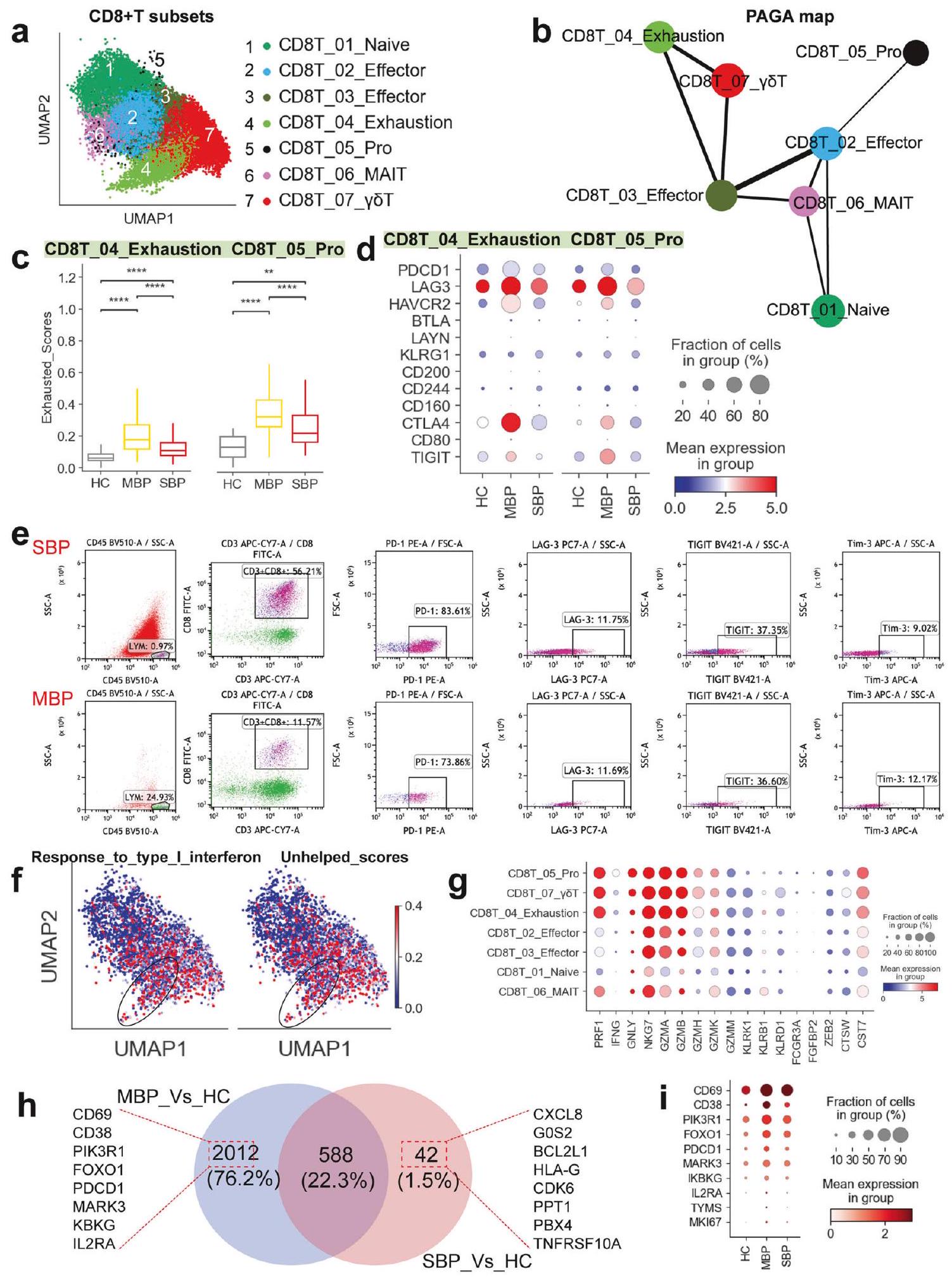 Fig. 4 Immunological features of T cell subsets. a The clustering result (Left row) of seven T cell types (right row) from 37 samples. Each point represents one single cell, colored according to cell type. b PAGA analysis of CD8 T cell pseudo-time: the associated cell type and the corresponding status are listed. c Box plots showing the exhausted scores in CD8_04_Exhaustion and CD8_05_Pro subsets across disease conditions. Significance was evaluated using the Kruskal-Wallis test with Bonferroni correction (*p , *** , ). d Dot plots showing the cell exhaustion-related markers in CD8_04_Exhaustion and CD8_05_Pro subsets across disease conditions. e Flow cytometry plots showing gating strategy and typical exhausted molecules in cells from patients with severe (top row) and mild (below row) bacterial pneumonia. f UMAPs illustrating IFN-I response and unhelped signature scores for each CD8 T cell. g Dot plots showing the cytotoxicity-related genes in T cell subsets in patients with bacterial pneumonia. h Venn diagram illustrating the number of upregulated genes in cells. i Dot plots showing the activation-related genes in cell across disease conditions