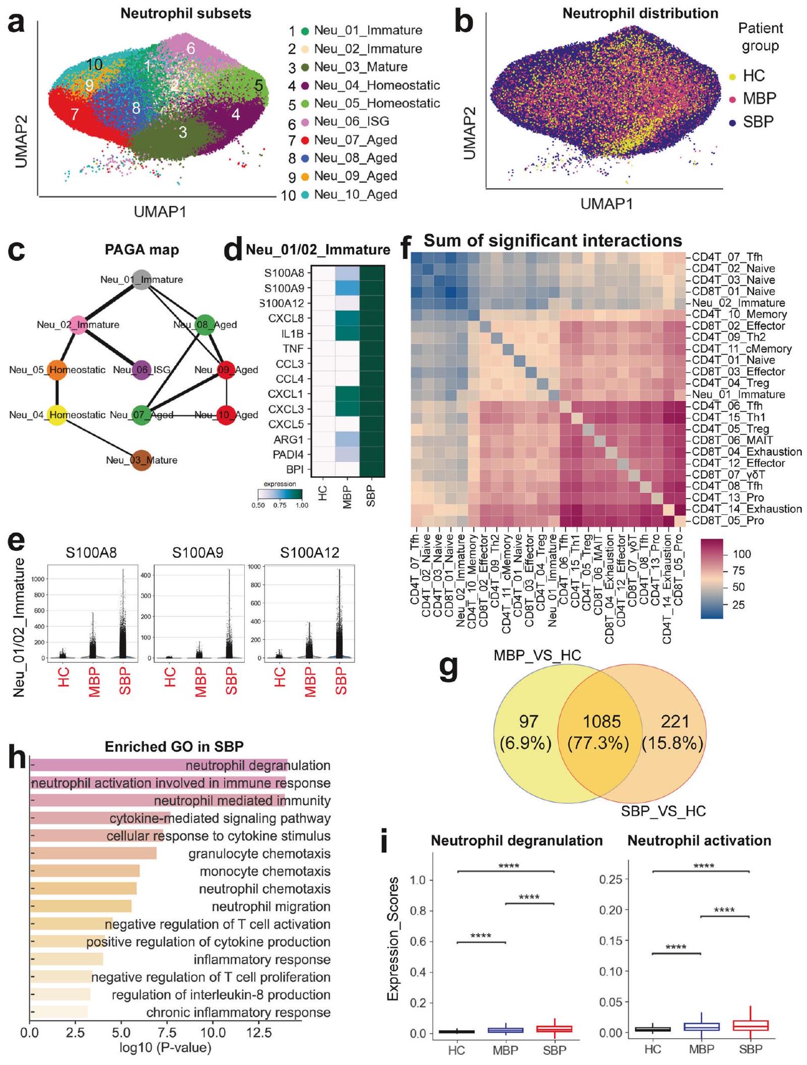 potential role in immune damage. Overexpressed genes were enriched in pathways associated with neutrophil activation and degranulation (Fig. 5h), suggesting a heightened state of neutrophil activity in severe infections. This hyperactivation can lead to the generation of NETs, which exacerbate inflammation and tissue damage, ultimately contributing to increased disease severity (Fig. 5i). Neutrophil activation and degranulation pathways exhibited significantly elevated expression levels in severe patients (Fig. 5i). Moreover, overexpressed genes in neutrophils were also implicated in inflammatory response and T cell inhibition (Fig. 5h), further supporting the role of neutrophils in exacerbating inflammation and suppressing adaptive immunity in severe infections. Consistent with these findings, genes associated with neutrophil activation, degranulation, inflammation, and T cell inhibition were obviously upregulated in patients with severe bacterial infections (Supplementary Fig. 13c). Together, these findings reveal that neutrophil heterogeneity and their gene expression profiles may play an important role in the immune response to bacterial infections, with heightened neutrophil activity potentially linked to disease severity and dysregulation of the immune system.