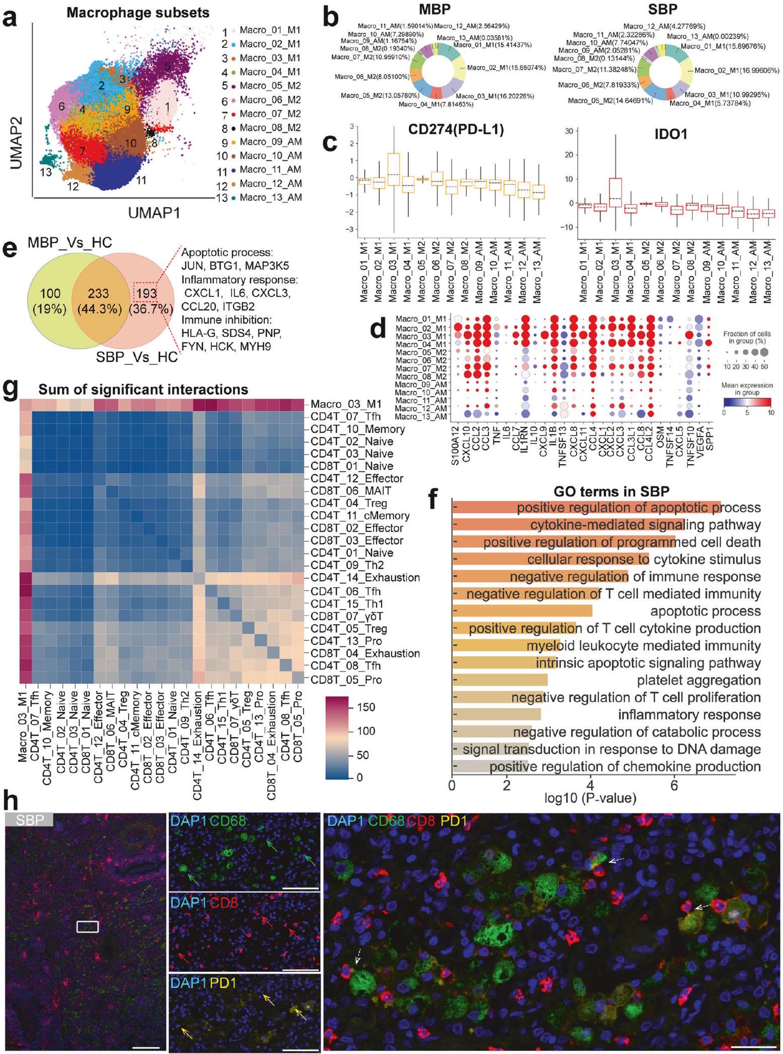 Fig. 6 Immunological features of macrophages. a The clustering result (Left row) of macrophage subtypes (right row) from 74 samples. Each point represents one single cell, colored according to the macrophage subtype. b Pie charts depicting the relative percentage of macrophage subtype in mild (Left row) and severe (Right row) patients. c Box plots showing the expression scores of PD-L1 and IDO1 in macrophage subtypes. d Dot plots showing the inflammation-related genes in macrophage subtypes. e Venn diagram illustrating the number of upregulated genes in Macro_03_M1. f Enriched GO biological process terms for upregulated genes in Macro_03_M1 from severe disease. Only select terms are shown. g Heatmap plots of the sum of significant interaction between Macro_03_M1 and T cell subsets. h A representative multicolor immunohistochemical (IHC) stained lung section from the SBP group is shown. Macrophages, CD8 T cells, and CD8 PD1 T cells are indicated by green, red, and yellow solid arrows, respectively. Interactions between macrophages and CD8 cell subsets are highlighted with white dotted arrows. Scale bars, (main image; Left) and (Magnified images, Middle and Right)