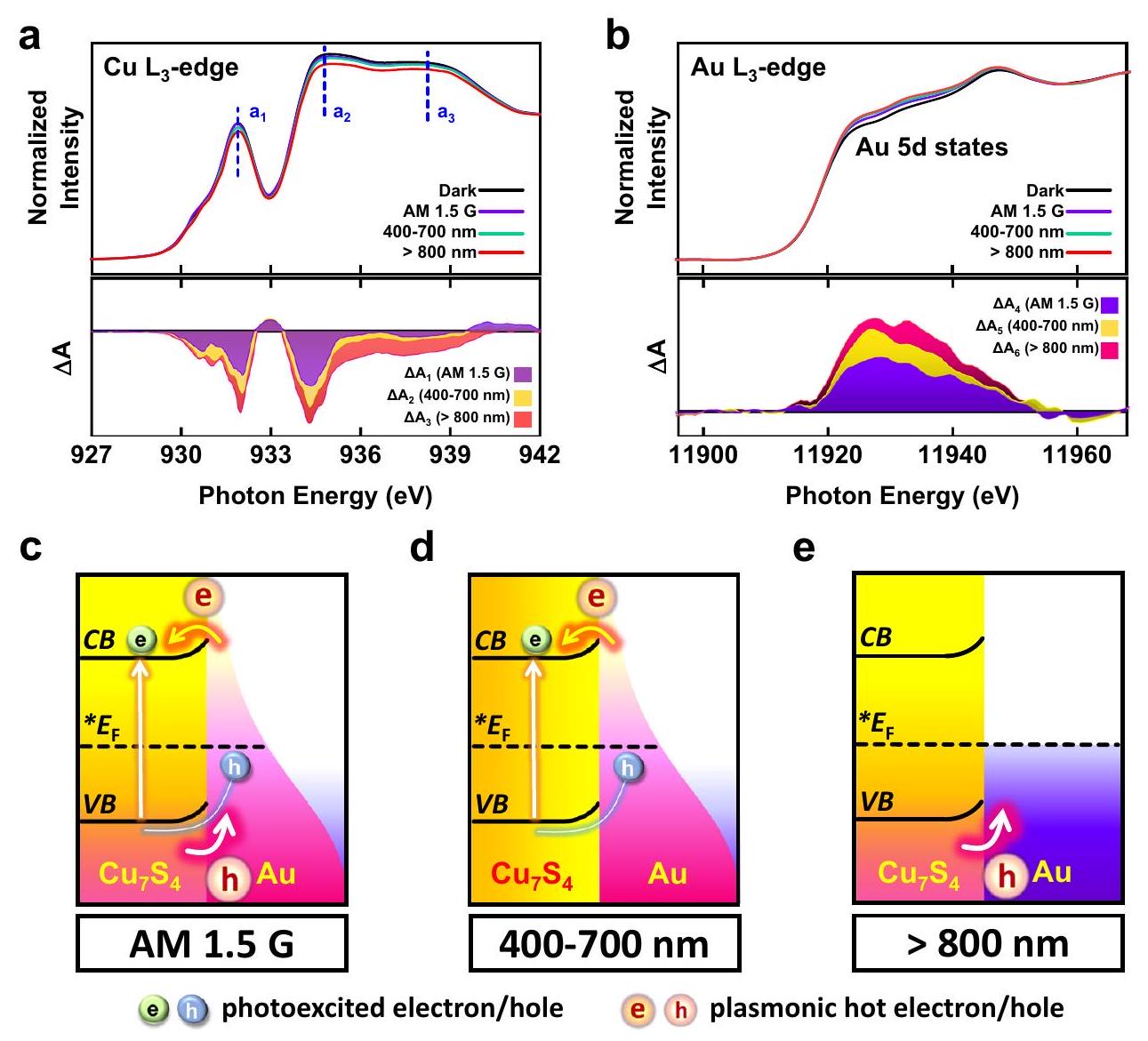 facilitated photoexcited hole transfer from to Au and enabled the photogenerated electrons to be concentrated in . Because the photoexcited holes were separated from the photogenerated electrons, radiative electron-hole recombination could be reduced to cause a depressed PL intensity for . The interfacial upward band bending can also steer the dynamics of hot charge carriers produced from plasmonic Au and plasmonic . An instance of this scenario would be the injection of hot electrons from Au into along the bent conduction band (CB) and the pass of hot holes from to Au through the bent valence band (VB). To validate the charge transfer mechanism for these hot carriers, in-situ XAS measurements were conducted on by introducing a secondary irradiation to excite the LSPR. The experiment separately utilized irradiation of AM 1.5 G , visible and NIR light to explore the pathways of charge transfer associated with plasmonic Au and plasmonic . The real-time evolution of the unoccupied density of states (UDOS) with light irradiation can be derived by comparing the XAS spectra of Cu and Au obtained under irradiation and dark conditions . Fig. 2a, b show the -edge and -edge spectra for recorded in the dark and under the three irradiation conditions. At the -edge, three distinct peaks were detected at approximately and . The prominent peak, , was associated with the electron excitation from to the unoccupied state that constituted the CB edge of . The considerably broad peaks, and , were ascribed to the electronic transition from to the mixed and empty states and from to the empty ligand states of the CB of , respectively. Further implications in the charge transfer pathways can be obtained by analyzing the -edge spectra under different irradiation conditions. Under AM 1.5 G irradiation, a perceivable decrease in spectral intensity was observed, which can be reflected by the negative intensity difference ( ) distributed in the three peak regions in Fig. 2a. The decrease in the XAS intensity signified a reduced UDOS for the component of as a result of the accumulation of excited electrons. Note that AM 1.5 G irradiation not only caused band edge excitation of , but also induced plasmonic excitation of both Au and , as derived from the band alignment illustrated in Supplementary Fig. 1d. Consequently, the photoexcited electrons and holes from can accompany the hot electrons from plasmonic Au and the hot holes from plasmonic participating in the charge relaxation processes. As depicted in Fig. 2c, the possible charge transfer pathways included photoexcited hole transfer from to Au , hot electron injection from plasmonic Au to and hot hole injection from plasmonic to Au . These events can operate together to result in an accumulation of excited electrons at , leading to a decrease in UDOS for , as evidenced by a negative . In order to decouple these charge transfer pathways, spectral comparison between dark condition and visible ( ) or NIR ( ) irradiation was carried out. Even with visible irradiation, the reduction in the intensity of the -edge spectrum remained noticeable, as reflected by a considerably negative in the three peak regions. Note that visible irradiation merely caused two types of excitations, namely band edge excitation of