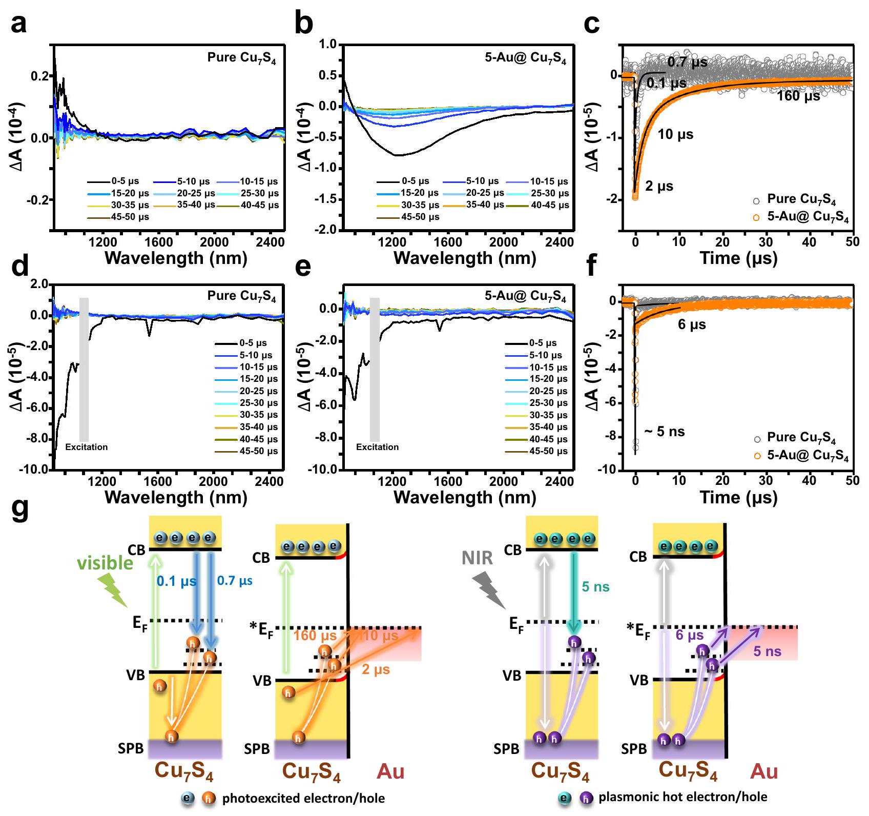 To depict a comprehensive picture of interfacial charge transfer processes, the carrier relaxation dynamics of the samples were further studied by using visible-NIR pump-probe TAS in the time region spanning from 100 fs to s with probing wavelengths between 550 and 2000 nm . The charge transfer dynamics of the component for pure and were exclusively monitored and compared because was mainly responsible for harvesting incident photons for charge carrier generation. For the TAS experiments, femtosecond (for fs-ns time spans) or nanosecond (for ns- time spans) visible and NIR pulses were employed to render component band edge or plasmonic excitation. The femtosecond TAS profiles of pure and 5- are shown in Supplementary Figs. 2a, d and Supplementary Figs. 2b, e, respectively. The samples were pumped using 500 and 1400 nm excitation pulses resonant with excitonic and plasmonic absorptions, respectively, and probed in the sub-band gap region from 550 to 950 nm to uncover the relaxation dynamics of the surface trap states. Both pure and 5-Au@ showed a rapidly decaying photoinduced absorption (PIA) band due to hot hole injection into the surface states, irrespective of the excitation wavelength. Although the spectral features for pure and were similar, their magnitudes and decay dynamics substantially varied, indicative of the divergence in the underlying charge transfer mechanism. Under the same excitation conditions, showed stronger PIA bands due to its larger absorption cross-section. It is important to mention that plasmonic excitation by NIR pulses could produce PIA bands with similar magnitudes to those produced under band edge excitation despite a much weaker laser fluence of NIR pulses ( 7 times smaller than the visible pulses). This outcome suggested that the hot hole dynamics of upon plasmonic excitation were as effective as the charge carrier dynamics of from band edge excitation. The carrier thermalization times were observed to occur between 0.6 and 0.8 ps, as displayed in Supplementary Figs. 2c, f, with 5-Au@Cu7 showing a slightly faster cooling rate. Nanosecond TAS experiments were further performed to probe the surface state-mediated carrier relaxation dynamics and thereby attain a better understanding of the carrier relaxation mechanism. Figure 3 presents the spectral and temporal profiles of NIR transients ( 850 to 2500 nm ) for pure and obtained by pumping the samples using nanosecond visible ( 532 nm ) and NIR ( 1064 nm ) pulses. The NIR transients of pure comprised weak spectral features and exhibited instrument response limited decays under both visible and NIR excitations, whereas 5-Au@Cu7 showed significant bleaching of plasmonic bands with retarded recombination processes. The significant photo-bleaching of the plasmonic bands of under visible excitation was attributable to the increase in