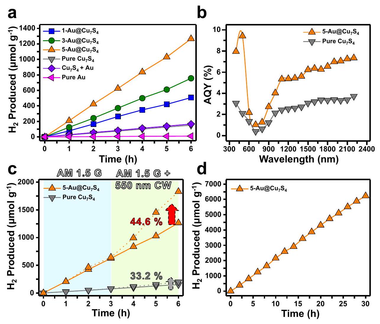 الدور الحاسم لهياكل النانو من نوع الصفار@القشرة في تحقيق إنتاج هيدروجين متفوق تم تأكيده بشكل أكبر من خلال تقييم أداءنشاط إنتاج الهيدروجين من الذهبكان، تقريبيًا أداء النقي“. كما تعرض الشكل.تميز بتغطية سطحية ملحوظة لـ بواسطة الذهب المجمع. يمكن أن يؤدي هذا الاضطراب المجهري إلى تدهور كبير في فعالية نقل الشحنات عند الواجهة، مما يسبب نشاطًا أقل. لاحظ أن تم الحصول عليه ببساطة عن طريق خلط الكولوييدات الذهبية والنقيةتعليق مع تركيزاتها المعدلة عمدًا لتساوي تلك الخاصة بـ 5-Au@Cu7. بعبارة أخرى، كمية الذهب وفيكان على التوالي مساوياً لمقدار الذهب و في 5-Au@Cu7 مع هذا التحكم المتعمد يمكن مقارنة أداء النشاطمعقدم استنتاجًا موثوقًا بأن هياكل النانو من الصفار والقشرة لعبت دورًا حاسمًا في تحقيق إنتاج هيدروجين متفوق. لتوضيح السبب وراء النشاط المعزز لـتم قياس AQYs لإنتاج الهيدروجين تحت الإشعاع بالضوء أحادي الطول الموجي. كما هو موضح في الشكل 4b، النقي و 5- عرضت ميزات طيفية مماثلة مع AQYs بارزة عبر منطقتين مختلفتين من الطول الموجي. بالنسبة لـكان الـ AQY البارز عند الأطوال الموجية أقل من 700 نانومتر مرتبطًا بالانتقال تحت الفجوة وإثارة حافة النطاقبينما كانت AQY المزدهرة فيالمنطقة نشأت من الإثارة البلازمونية لـ.