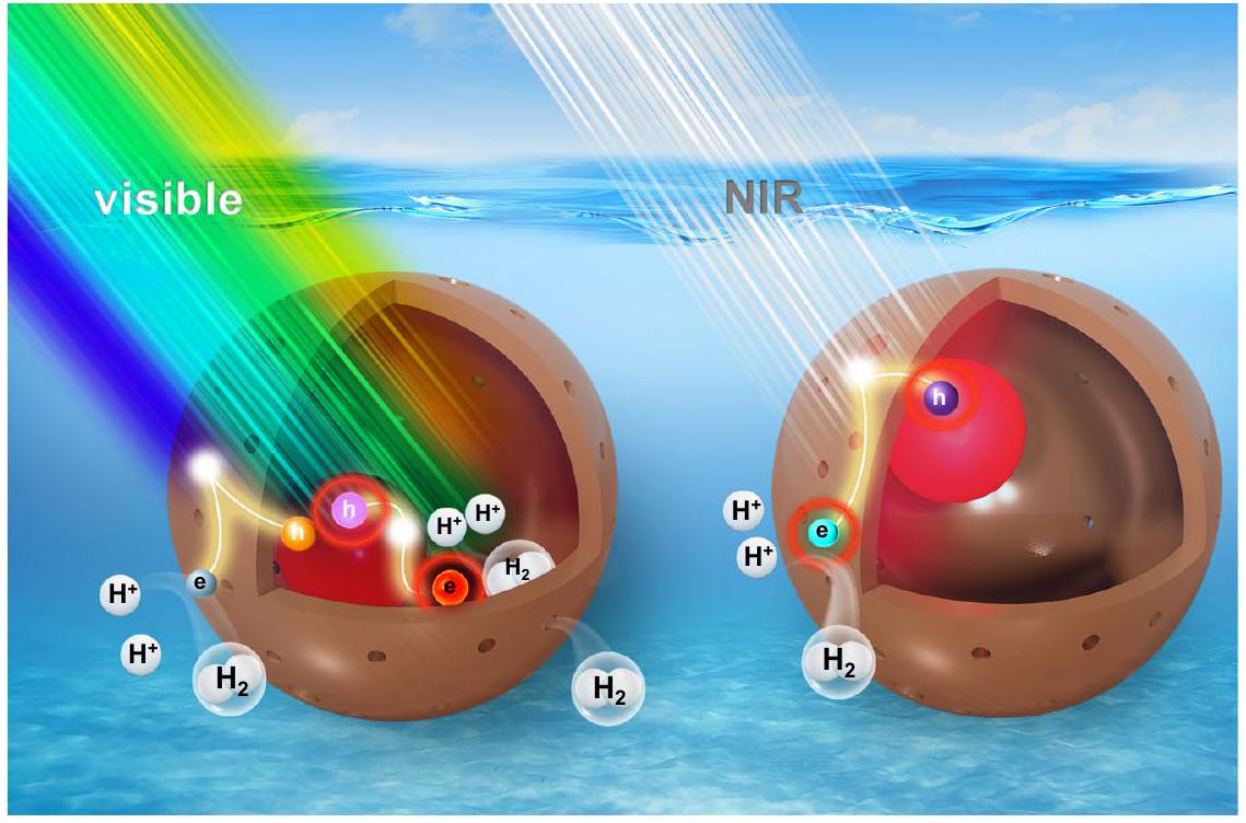 In contrast to the numerous reports dealing with photocatalytic hydrogen production over plasmonic Au, the number of reports tackling solar hydrogen production over plasmonic is still very limited . In this work, yolk@shell nanocrystals were synthesized and employed as photocatalysts for remarkable hydrogen production across the visible to NIR spectral region. The yolk@shell nanostructures possess many fascinating material properties suitable for photocatalytic reactions. First, the yolk particles are encapsulated in the shell, preventing their aggregation and detachment during the reaction process and thus ensuring superior long-term stability. Second, the hollow shell provides abundant active sites by offering both inner and outer surfaces for accessing the reacting species. Third, the permeable shell allows diffusion of reacting species; the void space within the shell can thus provide a confined space that can function as a robust nanoreactor to expedite the interactions of reactant and product species. Furthermore, the mobile yolk particles can stir the reaction solution to create a homogeneous environment, which accelerates the mass transport kinetics to increase the reaction rate as