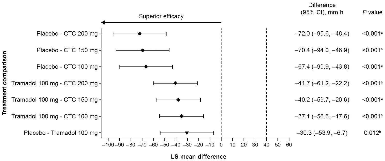 آثار العلاج المتفوقة ذات الصلة لـ CTC مقارنةً بالترامادول، مع الأخذ في الاعتبار الحاجة إلى إثبات تفوق CTC على الدواء الوهمي وعدم تفوقه على الترامادول. لإظهار عدم تفوق CTC مقابل الترامادول (مع افتراض هامش عدم التفوق من