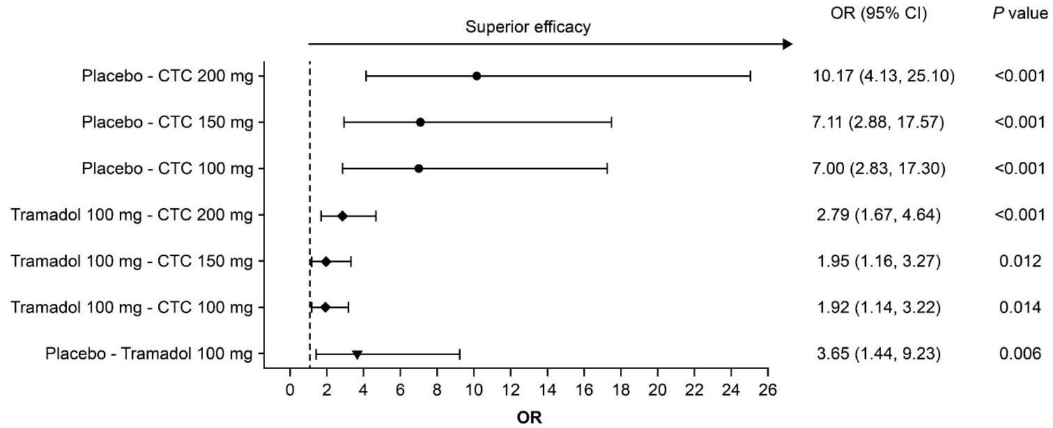 الاستنتاجات: أظهر CTC تخفيفًا أفضل للألم مقارنةً بالترامادول أو الدواء الوهمي، بالإضافة إلى تحسين في نسبة الفائدة/المخاطر مقارنةً بالترامادول.