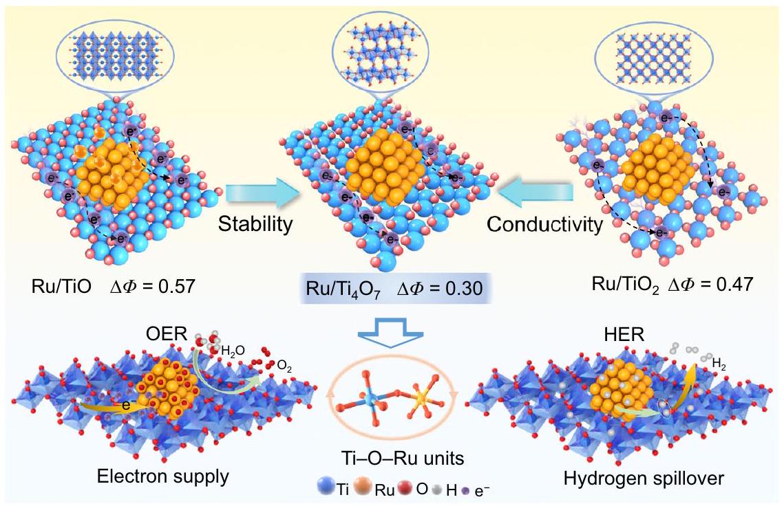 كما هو موضح في الشكل 1، تم استخدام الهندسة غير الستيوكيومترية لتخصيص دعائم أكسيد التيتانيوم بدقة.، و ) مع فراغات الأكسجين ذات الترتيبات الدورية. ، مع عيوب مرتبة بانتظام، يظهر كمنافس محتمل يتمتع باستقرار هيكلي متفوق على TiO متعدد العيوب وموصلية أعلى بكثير منالأهم من ذلك،يعرض تفاعل دعم المعادن المناسب، الذي يؤسس لنشاط الوظيفة المزدوجة لـفي كل من HER وOER. من ناحية، فإن وظيفة العمل الأعلى مقارنة بجزيئات Ru النانوية تعزز غنى الإلكترونات في Ru، مما يمكن أن يخفف من ذوبان Ru في OER. من ناحية أخرى، مقارنة بـ TiO والحد الأدنى من فرق دالة العمل بين و جزيئات Ru ( يمكن أن يقلل من حاجز شوتكي للواجهة (الشكل التكميلي 1)، مما يعزز نقل الإلكترونات في المحفز المركب ويحفز تسرب الهيدروجين أثناء تفاعل تطور الهيدروجين.