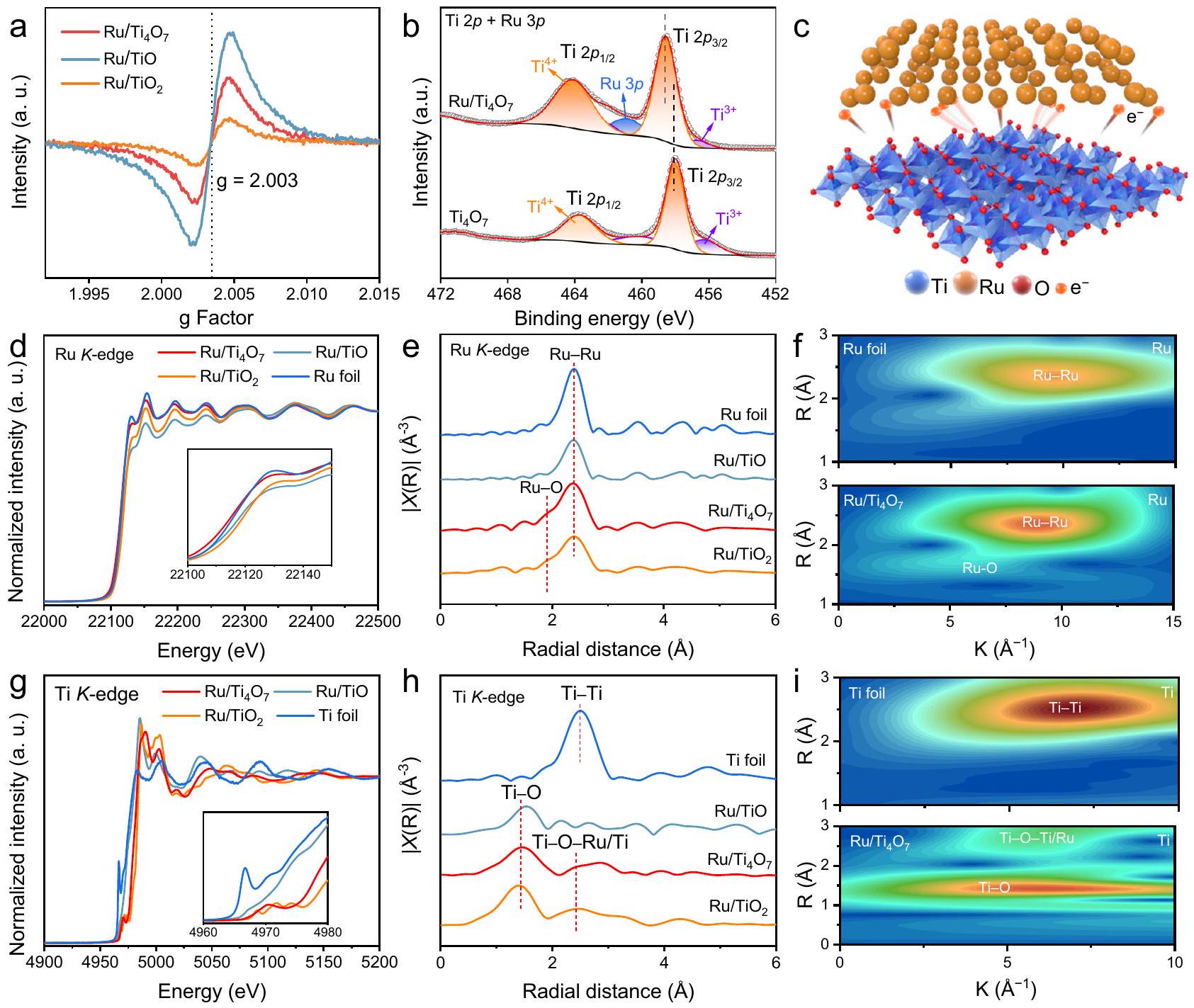(Fig. 3e). This phenomenon should originate from the interface units between Ru and titanium oxide, which is observed in the wavelet transform more clearly (Fig. 3f). The stable units effectively stabilize the active species and serve as an electron channel to further reduce the interface electron transfer resistance . As shown in Fig. 3 g , the shift of Ti pre- -edge reflects the changed oxide valence states of Ti in different stoichiometric titanium oxide supports. Furthermore, As illustrated in the -weighted EXAFS Fourier transforms of -edge of and (Fig. 3 h ) and the corresponding wavelet transform (Fig. 3i), the structure belonging to further verifies the formation of the interface units.