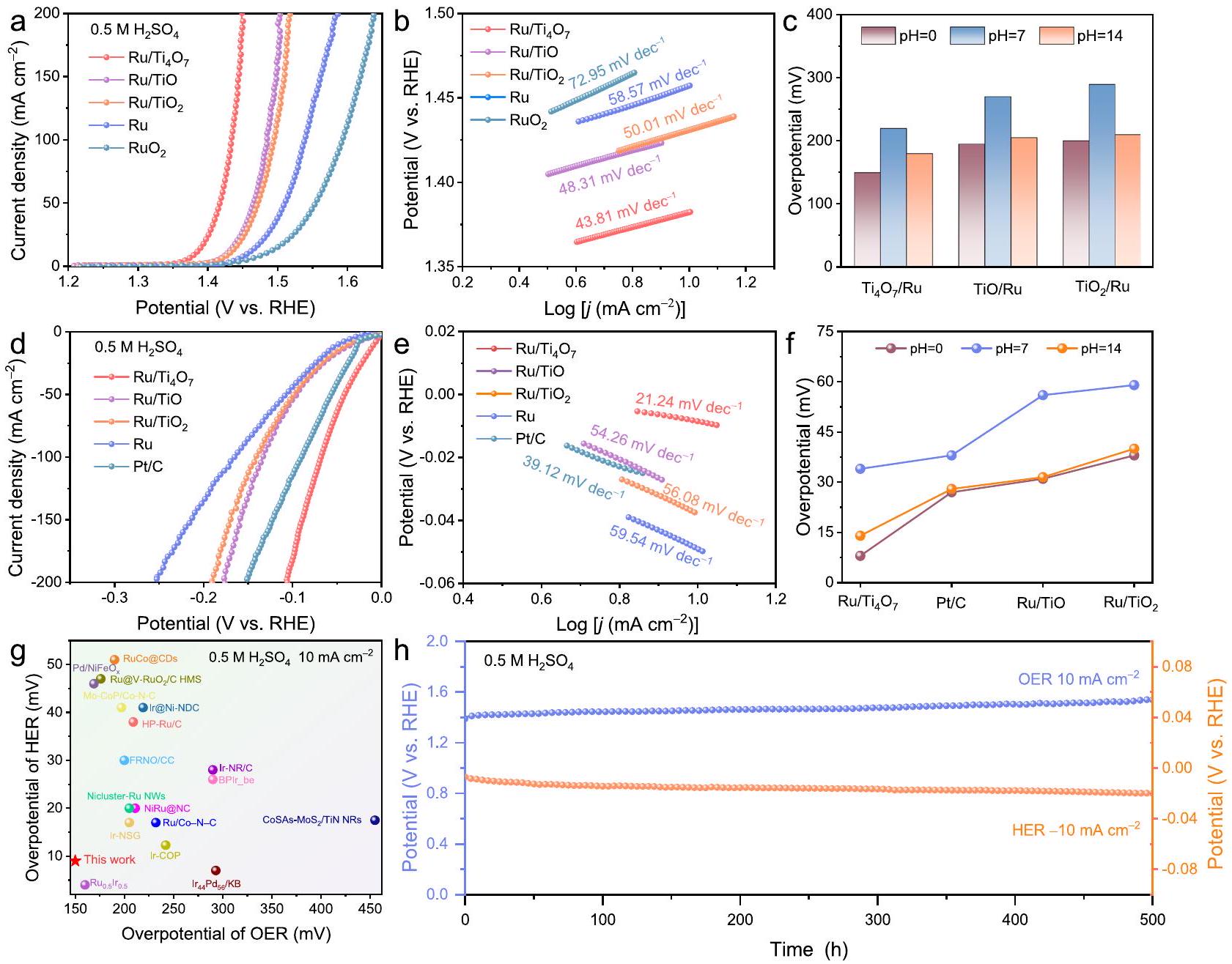 The electrocatalytic activities of the Ru-loaded titanium oxides were evaluated in a standard three-electrode system to verify the unique advantages of the support. In the acidic media, with optimized Ru loading and annealing temperature exhibits the lowest OER overpotential ( 150 mV at , Fig. 4a and Supplementary Fig. 12) and Tafel slope ( , Fig. 4b, c). For HER, also displays an ultra-low overpotential of 8 mV at in acidic