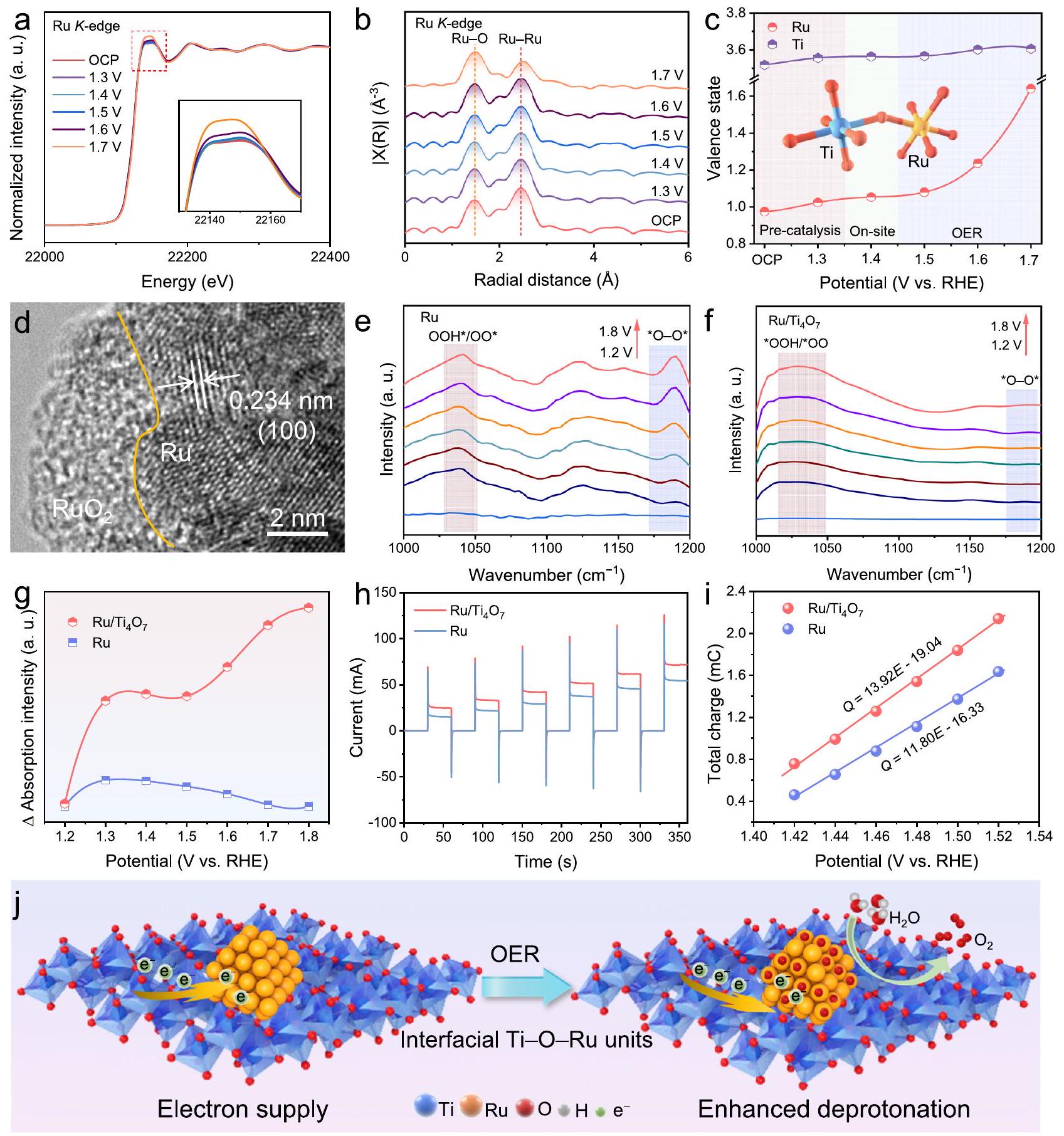 Fig. | In-situ characterization and reaction mechanism. a Normalized in-situ Ru -edge XANES of . The corresponding -weighted Fourier transforms. c The valence states of Ru and Ti in obtained via -edge under different potentials. d HRTEM of after OER. In-situ ATR-SEIRAS spectra of (e) Ru and for OER in under different potentials vs. RHE. Intensity difference of the infrared signals at 1038 and Current responses to pulse voltammetry for Ru and . i Relationship between charge storage and potential of Ru and Schematic illustration of the optimized OER process induced by the support.