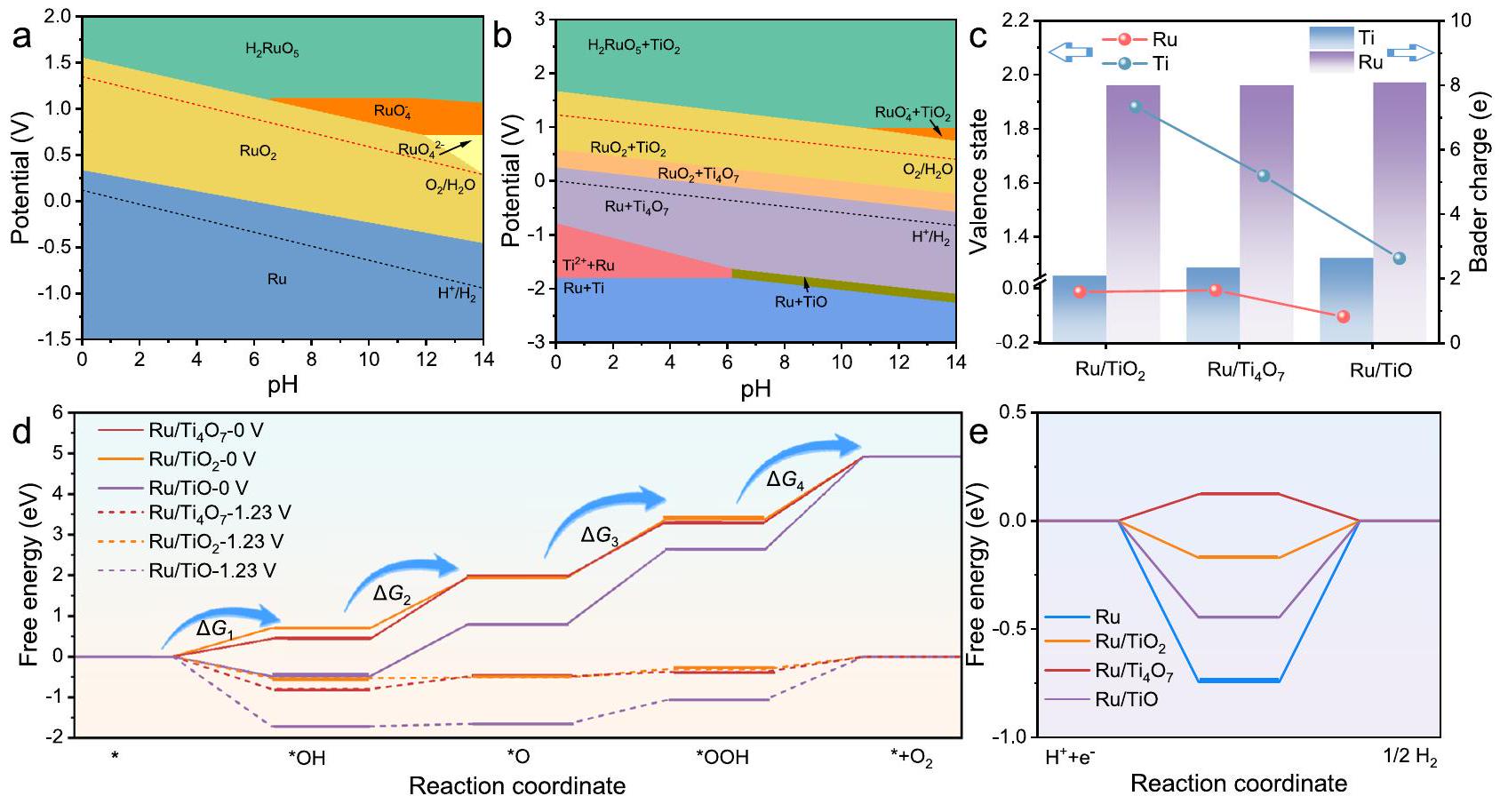 الشكل 6 | الحساب النظري وعلاقة الهيكل بالنشاط. أ Ru-O، و (ب)رسوم بوربايكس التي تم إنشاؤها مع تركيز أيونات مائية منمات. شحن باد في واجهة ، و وحالات التكافؤ المحسوبة المقابلة لـ Ru و Ti. د ملفات الطاقة الحرة لـ