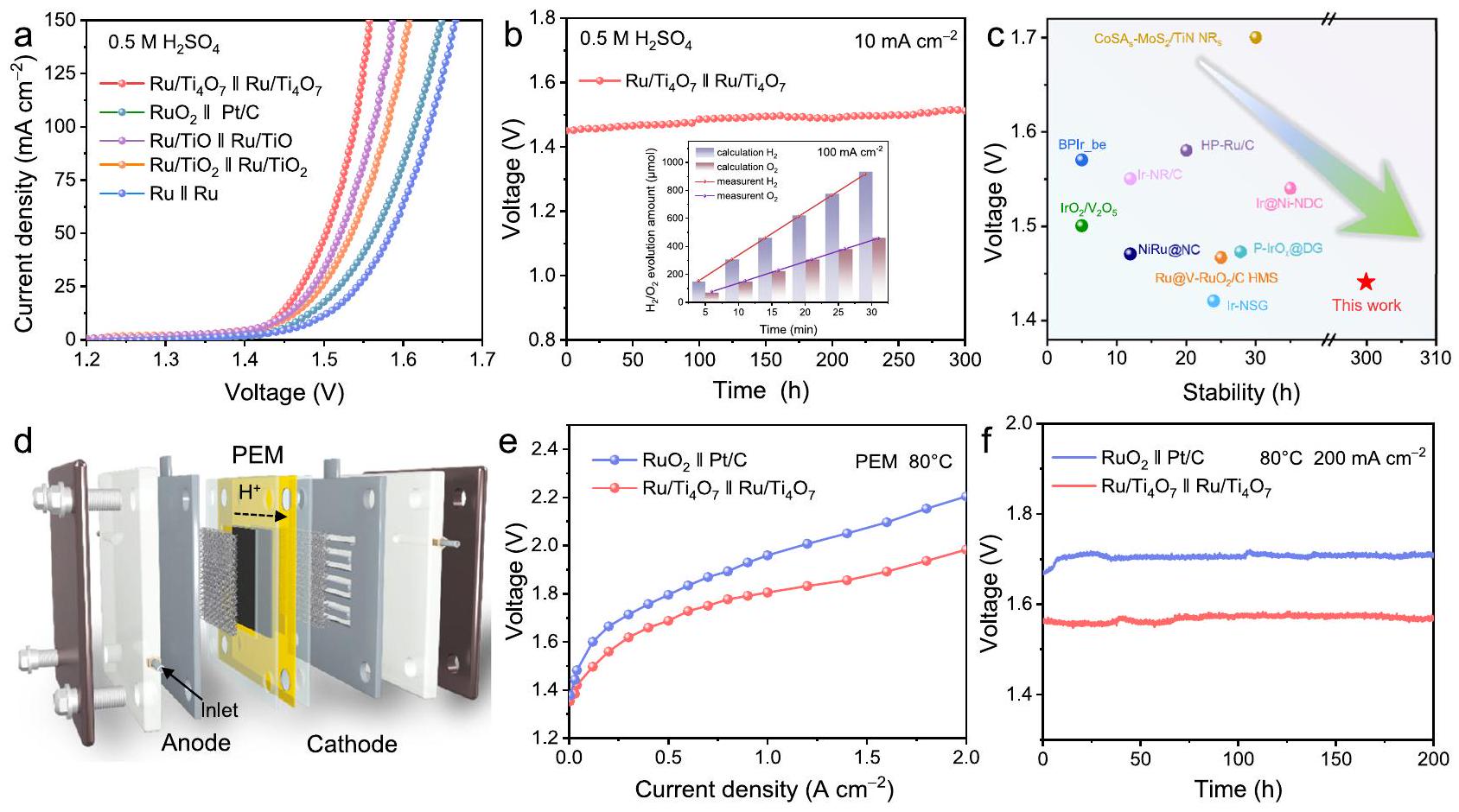 catalysts for acidic water splitting. d Conceptual model of the PEM water electrolyzer flow cell using pure water as feedstock. e Steady polarization curves of Ru/ and (loading amount: ) for PEM water electrolyzer in pure water at . f Stability tests of for PEM water electrolyzer at . and robust operation at for 300 h . This outstanding performance validates the advancement of delicate support design for water electrolysis devices and opens new avenues for the rational construction of OER catalysts.