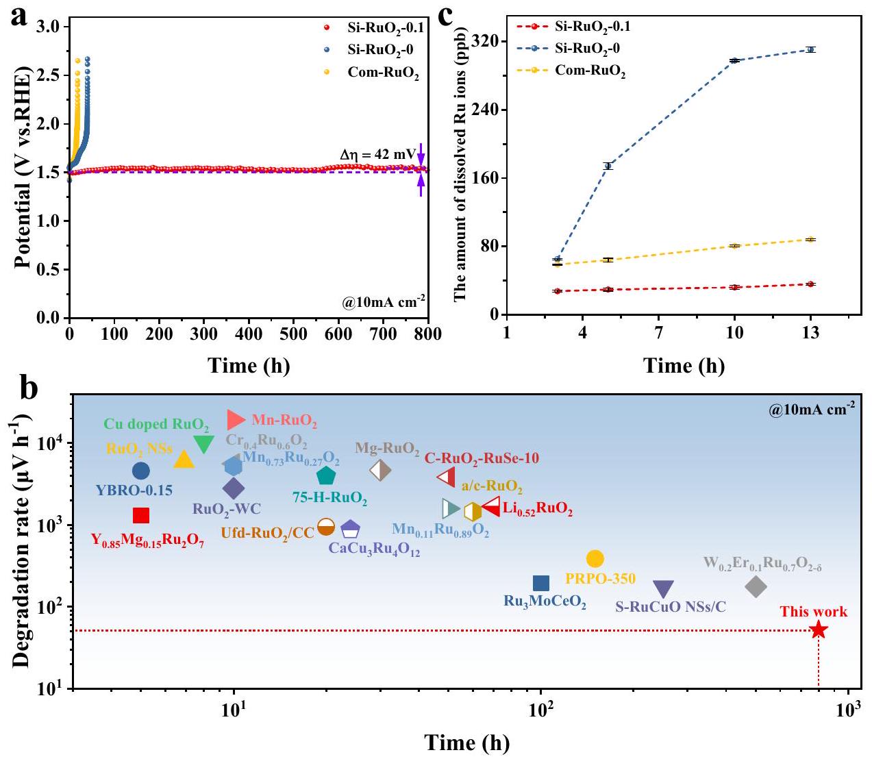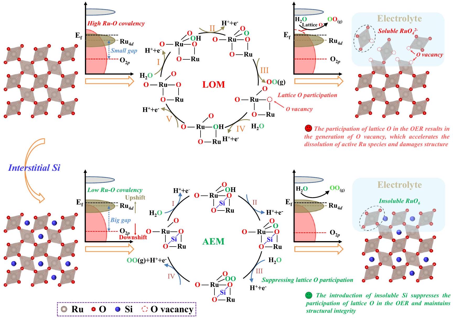ثاني أكسيد الروثينيوم هو حاليًا أكثر المحفزات نشاطًا لتفاعل تطور الأكسجين (OER) في الوسط الحمضي، ولكنه يعاني من ذوبان الروثينيوم الشديد الناتج عن التساهمية العالية لروابط الروثينيوم-أكسجين مما يؤدي إلى أكسدة الأكسجين الشبكي. هنا، نبلغ عن استراتيجية تخديم السيليكون بين الفجوات لاستقرار المواقع النشطة للغاية للروثينيوم.
