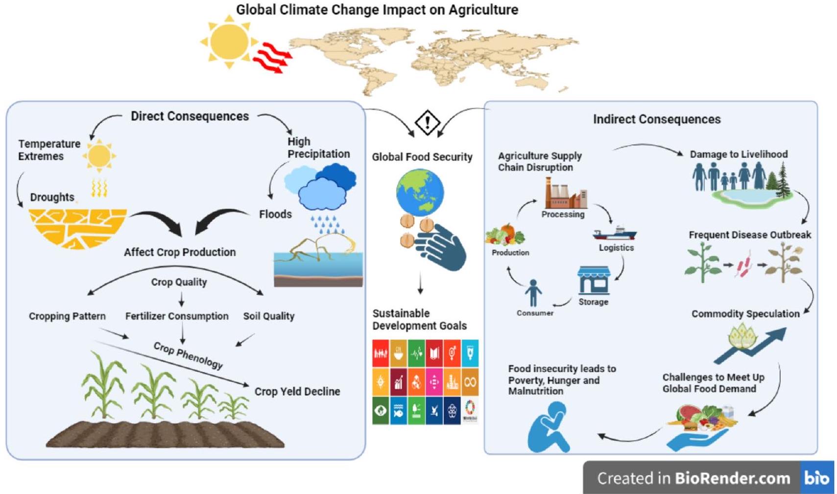 Climate alteration poses a consistent threat to food security and agriculture production system. Agriculture sector encounters severe challenges in achieving the sustainable development goals due to direct and indirect effects inflicted by ongoing climate change. Although many industries are confronting the challenge of climate change, the impact on agricultural industry is huge. Irrational weather changes have raised imminent public concerns, as adequate output and food supplies are under a continuous threat. Food production system is negatively threatened by changing climatic patterns thereby increasing the risk of food poverty. It has led to a concerning state of affairs regarding global eating patterns, particularly in countries where agriculture plays a significant role in their economies and productivity levels. The focus of this review is on deteriorating consequences of climate alteration with the prime emphasis on agriculture sector and how the altering climatic patterns affect food security either directly or indirectly. Climate shifts and the resultant alteration in the temperature ranges have put the survival and validity of many species at risk, which has exaggerated biodiversity loss by progressively fluctuating the ecological structures. The indirect influence of climate variation results in poor quality and higher food costs as well as insufficient systems of food distribution. The concluding segment of the review underscores the emphasis on policy implementation aimed at mitigating the effects of climate change, both on a regional and global scale. The data of this study has been gathered from various research organizations, newspapers, policy papers, and other sources to aid readers in understanding the issue. The policy execution has also been analyzed which depicted that government engrossment is indispensable for the long-term progress of nation, because it will guarantee stringent accountability for the tools and regulations previously implemented to create state-of-the-art climate policy. Therefore, it is crucial to reduce or adapt to the effects of climate change because, in order to ensure global survival, addressing this worldwide peril necessitates a collective global commitment to mitigate its dire consequences.
