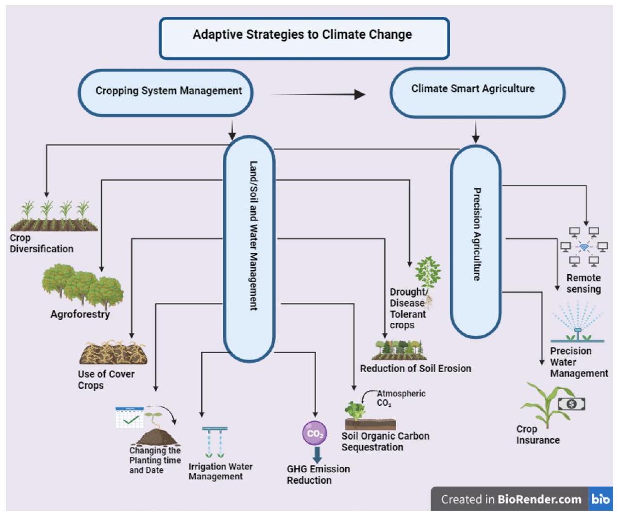 الحفاظ على خدمات النظام البيئي الإضافية وتعزيز المرونة أمام الصدمات كعناصر أساسية لتحقيق زيادة الإنتاجية. قد تشمل أساليب الزراعة المستدامة طرقًا متكاملة لإدارة الآفات وخصوبة التربة، واستخدام أفضل وأكثر كفاءة للمياه والمواد الغذائية. تم التعرف على إدارة التربة كواحدة من أهم الاستراتيجيات للتكيف مع تغير المناخ، حيث تحتوي التربة على جميع العناصر الغذائية اللازمة للنمو الزراعي [107]. أدت زيادة التباين في المناخ والظواهر الجوية القاسية مثل الأمطار الغزيرة والرياح القوية إلى تسريع تآكل التربة. لذلك، يجب اعتماد استراتيجيات إدارة فعالة لتقليل الاضطراب في التربة. في المناطق شبه الجافة، لمواجهة تآكل التربة الناتج عن الرياح، يتم استخدام زراعة الأشجار وإنشاء الحواجز؛ كما تستخدم المناطق الرطبة والساحلية بشكل متكرر تغطية النباتات، وتقلبات التربة، وحواجز الرياح. تساعد زراعة الحدائق على المدرجات وجمع المياه في المناطق الجبلية في السيطرة على تآكل التربة [30]. يمكن أن تتفاعل أنظمة الزراعة مع الإجهاد المائي، والمياه الزائدة الناتجة عن الأمطار غير المناسبة، ودرجات الحرارة القصوى من خلال التحول إلى الحد الأدنى من الحراثة مع الاحتفاظ بالمخلفات. كما أشار سابكوتا وآخرون [91]، يمكن زيادة إنتاجية مياه الري، مقارنة بالأنظمة الزراعية التقليدية من خلال