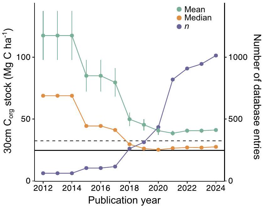 Fig. 2 | Seagrass soil organic carbon ( ) stock database summary statistics by data publication year. Seagrass soil stock mean (green), median (orange), and number of cores (purple) cumulatively calculated for each publication year from 2012. Organic carbon stocks include only measured values (minimum core length of 30 cm ). Standard error shown for the mean. Horizontal lines indicate the IPCC Tier 1 estimate (dashed; IPCC ) and our new database median (solid line, includes predicted stocks).