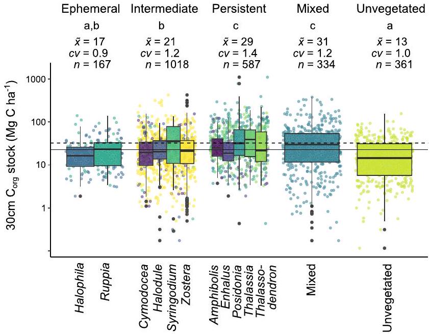 Fig. 3 | Box plots showing soil stocks by seagrass genus (colors), nested within functional group. Box plot elements are defined as in Fig. 1. Note the logarithmic -axis. Also shown are letters indicating differences between functional groups (Kruskal-Wallis, Dunn’s post hoc ), median carbon stocks , coefficients of variation ( ), and sample size ( ) for functional groups. Horizontal lines indicate the IPCC Tier 1 estimate (dashed) and our new database median (solid). Note that Zosteraceae were recently revised to encompass multiple genera, which is not reflected in this study . Two very low carbon stocks of the “unvegetated” group were excluded for display purposes.