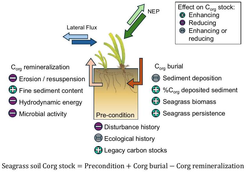 Fig. 4 | Conceptual diagram of factors driving soil stocks in seagrass systems. Seagrasses produce (net ecosystem productivity, NEP) and may exchange with adjacent systems (lateral flux). Soil stocks are a function of legacy carbon stocks, ecological and disturbance history (Pre-condition), increased by burial (affected by sediment deposition, content of deposited sediment, seagrass biomass, and persistence), and reduced by remineralization (affected by erosion, fine sediment content, hydrodynamic energy, and microbial activity). Factors with green symbols (+) generally increase soil stocks, while purple symbols (-) generally decrease soil stocks, and factors with gray symbols (=) have no generalizable direction. Seagrass symbol adapted from Catherine Collier, JCU (license: creativecommons.org/licenses/by-sa/4.0/).