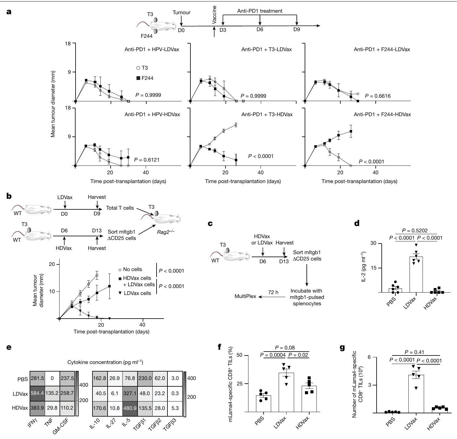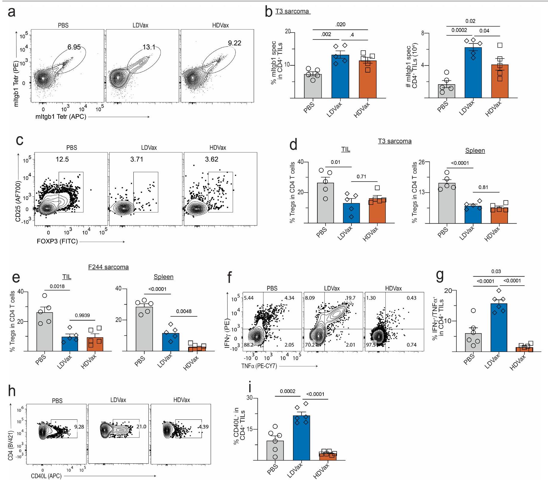 تكرار والأعداد المطلقة لخلايا CD4 المحددة بـ mItgb1كانت الخلايا اللمفاوية المتسللة إلى الورم (TILs) من الفئران المعالجة بـ HDVax أو LDVax مشابهة (الشكل البياني الموسع 1a، b). كشفت تحليلات تدفق السيتومتر أن التردد والأعداد المطلقة لـالخلايا في CD4 المحددة بـ mltgb1انخفضت TILs أو الطحال بشكل مماثل بعد علاج HDVax أو LDVax مقارنةً بالتحكمات المعالجة بـ PBS (الشكل 1c، d من البيانات الموسعة). لوحظت نتائج مماثلة مع الفئران الحاملة لورم F244 المعالجة بـ F244-HDVax أو F244-LDVax (الشكل 1e من البيانات الموسعة). كشفت تحليلات السيتوكين المتعددة عن أنماط مميزة من CD4تم تحفيز TILs بواسطة LDVax مقابل HDVax. بينما تم تحفيز CD4 الخاص بـ mItgb1 بواسطة T3-LDVaxأنتجت خلايا T IL-2 عند تحفيزها بخلايا الطحال المحملة بـ mItgb1، CD4 المحددة بـ mItgb1 الناتجة عن T3-HDVaxفشلت خلايا T في إنتاج IL-2 (الشكل 2c، d). بالإضافة إلى ذلك، بينما أدت لقاحات T3-LDVax إلى تحفيز CD4خلايا T أنتجت مستويات عالية من IFNTNF و GM-CSF (الشكل 2e)، CD4 المستحث بواسطة T3-HDVaxخلايا T أنتجت مستويات عالية من IL-10 و TGF، IL-5 و IL-27. تم تكرار هذه النتائج من خلال تحليلات صبغ الخلايا داخلية (الشكل 1f، g من البيانات الموسعة). علاوة على ذلك، بينما كانت خلايا CD4 الخاصة بـ mItgb1 تم جمع TILs من الفئران المعالجة بـ T3-LDVax والتي أظهرت مستويات مرتفعة من CD40L بعد تحفيز المستضد (LDVax: ; بي بي إس: فقط جزء صغير من CD4 الخاص بـ mItgb1 المستحث بواسطة T3-HDVax المنبه بمولد الضدتعبّر TILs عن CD40L (HDVax: ؛ الشكل التوضيحي الممتد 1h، i).
