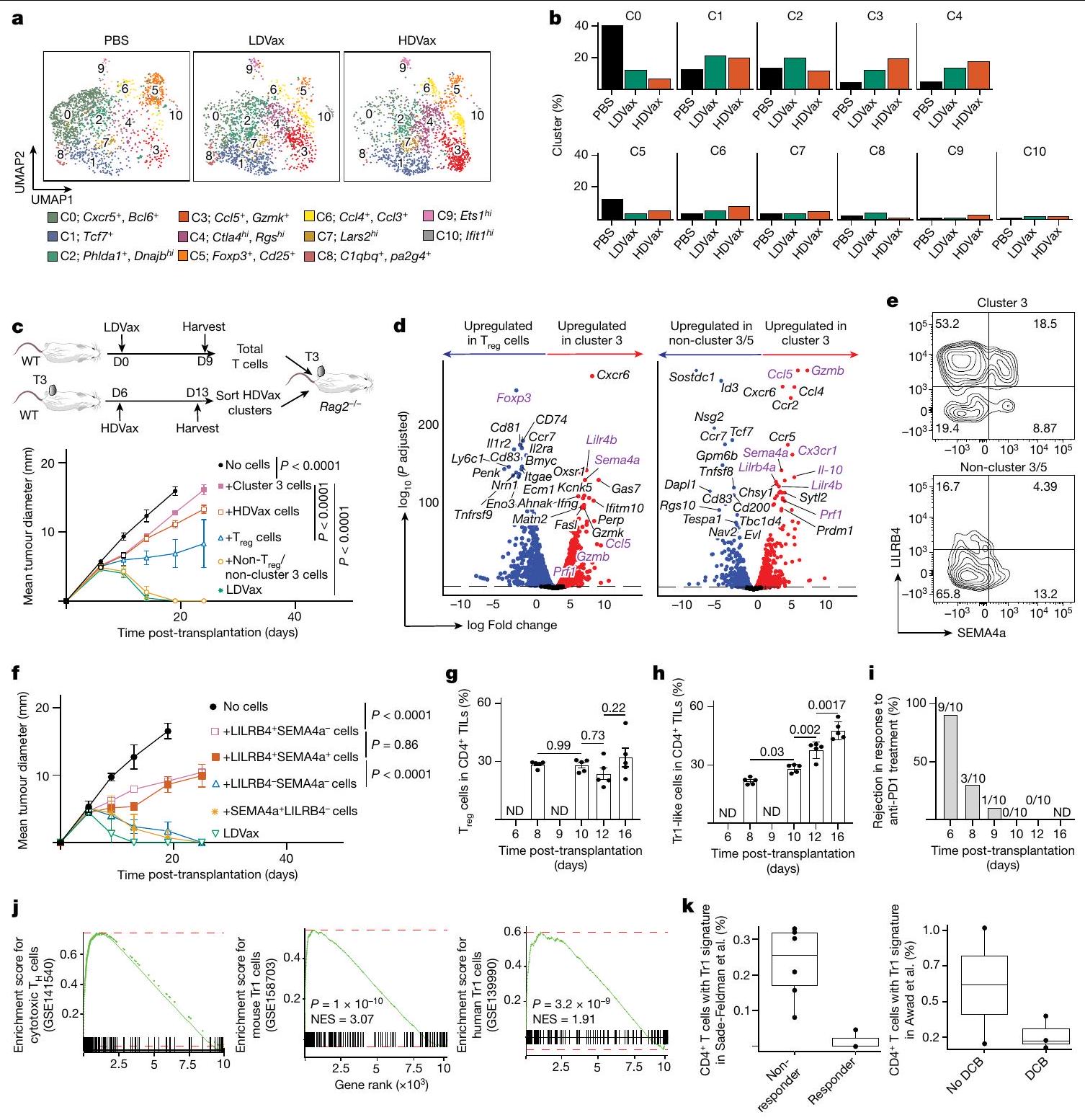 الشكل 3 | الخلايا المستحثة بواسطة HDVax هي خلايا Tr1 سامة للخلايا والتي تعتبر ضرورية وكافية لتثبيط HDVax. أ، UMAP يظهر مجموعات فردية في I--مستضد CD4 الخاص بـ mItgb1تحت ظروف مختلفة. ب، تكرار الخلايا التي تشغل مجموعات فردية. ج، نمو ورم T3 فيالفئران التي تلقت خلايا T من فئران LDVax بالإضافة إلى إجمالي CD25 CD4الخلايا (تقريبًا ) أو مجموعات فرعية مختلفة (حوالي ) مرتبة من الفئران المعالجة بـ HDVax ( ). د، مخطط البركان لبيانات تسلسل RNA الكمي المقارن للتعبير الجيني في خلايا المجموعة 3 بالنسبة إلى الخلايا (يسار) وغير المجمعةالخلايا (يمين).تم الحصول على القيم بعد تطبيق أداة DESeq 2. رسم بياني تمثيلي لتدفق الخلايا يظهر تعبير LILRB4 و SEMA4a في CD4 المحدد بواسطة mItgb1 المستحث بواسطة HDVax.الخلايا التائية في الأورام من النوع T3. نمو الورم من النوع T3 في الفئران Rag2-/- التي تتلقى خلايا T من فئران LDVax ومجموعات فرعية مختلفة (تقريبًا ) مرتبة من الفئران المعالجة بـ HDVax بناءً على تعبير LILRB4 و SEMA4a ( (PBS و LDVax) و للمجموعات الأخرى).تكرارالخلايا (غ) أو CD4 المعبر عن LILRB4 TILs (h) في أورام T3 التي تم جمعها في عدة أيام بعد حقن الورم ( ). ND، لم يتم الانتهاء. أنا، نسبة الفئران الحاملة لورم T3 التي نجت بعد ثلاث جرعات من مضاد PD1 بدأت في أيام مختلفة ( أو 12) زراعة ما بعد الورم، تليها جرعتان لاحقتان تُحقن كل 3 أيام. الأرقام الموجودة فوق كل عمود تمثل عدد الفئران التي رفضت الـ