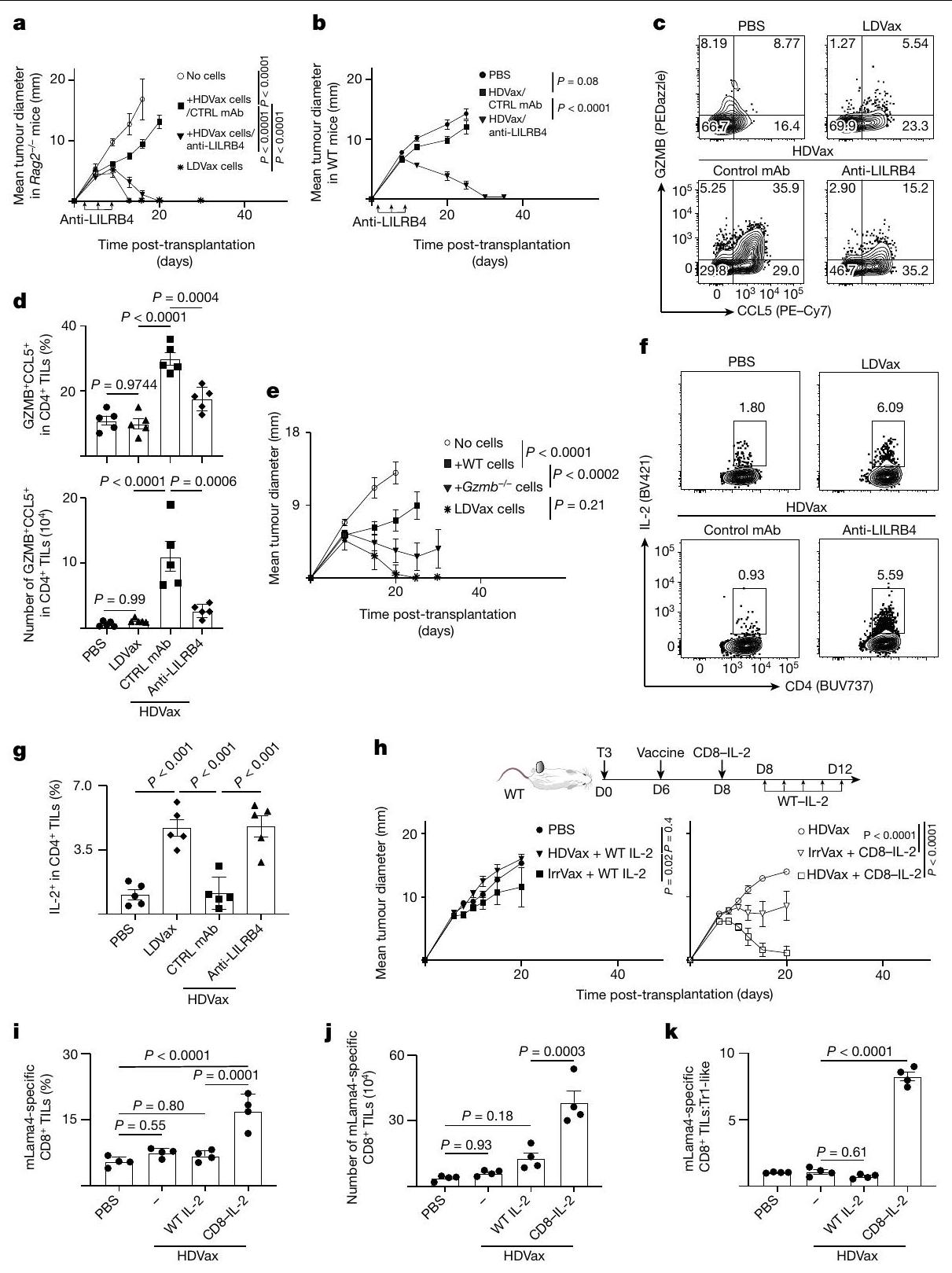الشكل 4 | علاج مضاد لـ LILRB4 يعكس تحفيز HDVax لـ GZMB/CCL5 وكبح إنتاج IL-2. أ، نمو ورم T3 في فئران Rag2-/ التي تتلقى خلايا T من فئران تم علاجها بـ LDVax بالإضافة إلى CD4 المحدد لـ mItgb1 الذي تم تحفيزه بواسطة HDVax والذي لا يحتوي على CD25.خلايا T (حوالي ) تليها معالجة بالأجسام المضادة الأحادية النسيلة المضادة لـ LILRB4 أو التحكم (CTRL) ( (PBS)، 5 (LDVax و anti-LILB4) و 8 لمضاد التحكم mAb).b، نمو ورم T3 في الفئران WT المعالجة بـ HDVax وحده أو مع anti-LILRB4 ( (PBS) و 10 لمجموعات أخرى). ج، مخططات تدفق تمثيلية تظهر تعبير GZMB/CCL5 في CD4تيلز المحملة على CD4. د، التردد (أعلى) والأرقام (أسفل) ل CD4 الذي يعبر عن GZMB/CCL5الخلايا التائية المستحثة في الأورام من النوع T3 بعد 7 أيام من العلاج ). e، 1956 نمو الورم في فئران Rag2-/- التي تتلقى خلايا T من فئران LDVax WT وخلايا CD4 الخاصة بـ mItgb1 السلبية لـ CD25 المستحثة بواسطة HDVaxخلايا T (حوالي ) من WT أو Gzmb فئران (لـ PBS و LDVax، و 7 لمجموعات أخرى). ف، تظهر مخططات تدفق الخلايا التمثيلية تعبير IL-2 في CD4تكرار الخلايا التي تعبر عن IL-2 في CD4خلايا T في عدة فئران ). نمو ورم T3 في الفئران البرية المعالجة كما هو موضح ومفصل في الطرق ( ). تم علاج الفئران الحاملة لورم T3 كما هو موضح في اللوحة، وتكرار ( ) والأرقام ( ) من CD8 الخاص بـ mLama4 الخلايا التائية المستحثة، ونسبة خلايا CD8 المحددة لـ mLama4الخلايا الشبيهة بـ Tr1تم تقييم TILs في اليوم الثالث عشر ). البيانات في الألواح يتم التعبير عنها كمتوسط قطر الورم س.م. ويمثل ثلاثة واثنين واثنين وثلاثة تجارب، على التوالي؛ تم إجراء الإحصائيات باستخدام تحليل التباين الثنائي، مع تصحيح المقارنات المتعددة باستخدام اختبار المقارنة المتعددة لسيداك. البيانات في الألواح تظهر كمتوسطيمثل s.e.m. ثلاثة، ثلاثة، اثنان وثلاثة تجارب، على التوالي؛ تم إجراء الإحصائيات باستخدام تحليل التباين الأحادي، مع تصحيح المقارنات المتعددة باستخدام طريقة توكي. CD4 التقليديخلايا T. CD8-IL-2 يوسع بشكل انتقائي CD8خلايا T في الفئران والرئيسيات وتحافظ على وظيفة CTL دون التسبب في السمية. لا T3-HDVax ولا الجرعات العلاجية المنخفضة من CD8-IL-2 (أدى إلى رفض الورم في الفئران الحاملة لـ T3 كعلاجات أحادية. بالمقابل، أدى الجمع بين T3-HDVax وجرعات تحت علاجية من CD8-IL-2 إلى رفض ورم T3 (الشكل 4h). كان دمج IrrVax مع CD8-IL-2 غير فعال. كانت المعالجة بالجمع لم تؤدِ WT IL-2 و T3-HDVax أو Irr-HDVax إلى رفض الورم ولكنها تسببت في سمية كبيرة، كما يتضح من فقدان الوزن في الفئران المعالجة. تم ملاحظة نتائج مشابهة باستخدام نماذج الورم F244 و 1956 (الشكل 8a و b في البيانات الموسعة، على التوالي).