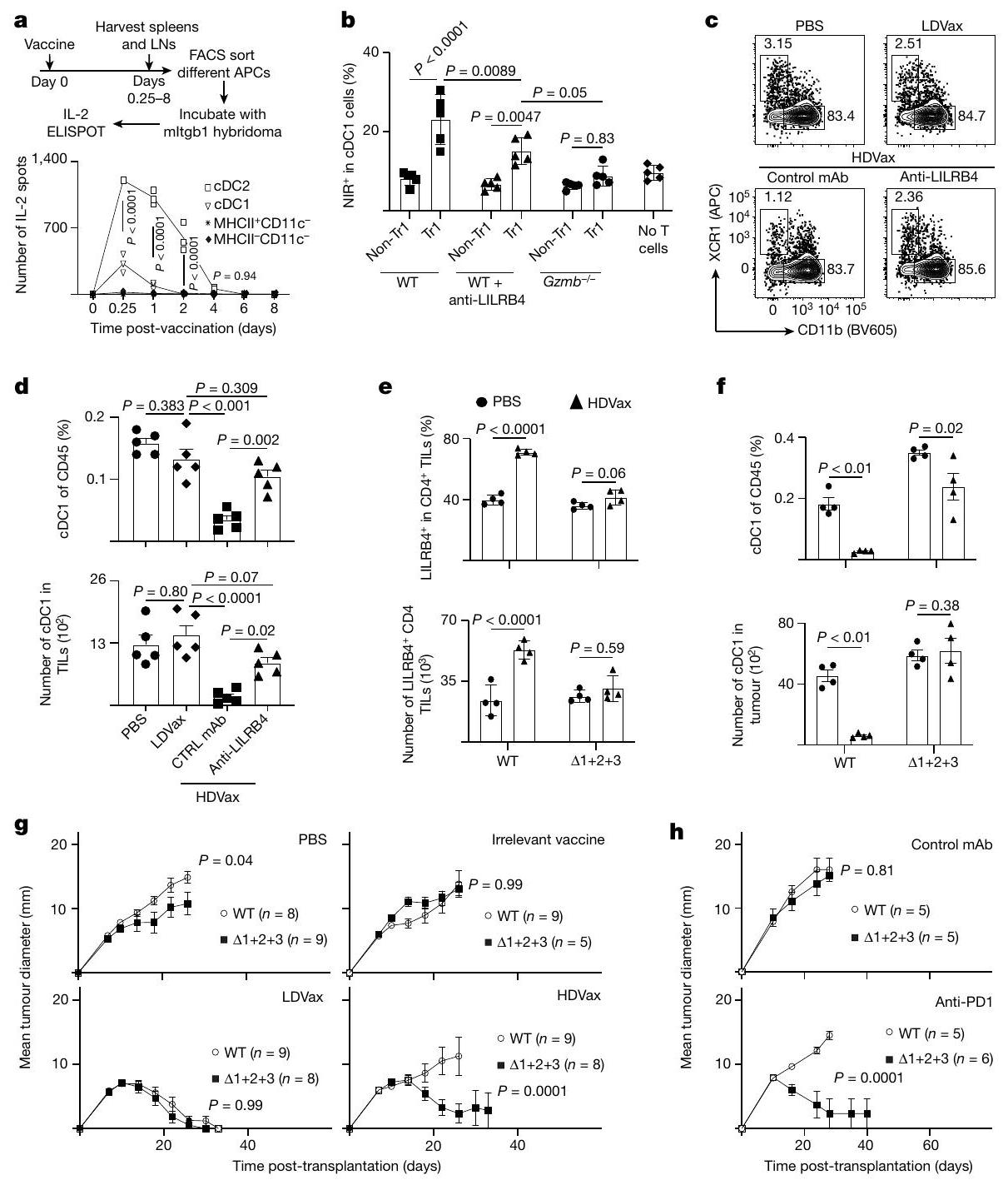 لقد أظهرنا أيضًا أن العلامات الظاهرية على خلايا Tr1 تختلف بناءً على المواقع التشريحية التي يتم عزلها منها. وبالتالي، بينما يتم تمييز خلايا Tr1-like المستحثة بواسطة HDVax في الطحال بشكل مختلف من خلال تعبير CD49b و LAG3 (المرجع 39)، فإن الخلايا في TILs تفتقر إلى التعبير التفاضلي عن هذه العلامات لكنها لا تزال تحتفظ بالقدرة على إنتاج IL-10، السيتوكين المميز لخلايا Tr1. بالمقابل، يحدد تعبير LILRB4 بوضوح خلايا Tr1-like في الفئران من كل من الطحال وبيئة الورم الدقيقة. ومع ذلك، بينما يتم ترميز LILRB4 في الفئران بواسطة جين Gb49b واحد، فإنه ينتمي إلى عائلة أكثر تعقيدًا في البشر تتكون من خمسة جينات مختلفة.ستكون الجهود المبذولة لتعريف النظير البشري هدفًا أساسيًا للعمل المستقبلي وقد توفر أداة لتحديد وجود مثل هذه الخلايا بسهولة لدى المرضى المصابين بالسرطان. هذا مهم لأن خلايا Tr1 المثبطة المستحثة بواسطة HDVax وخلايا CD4 المساعدة المستحثة بواسطة LDVax.تعبّر عن مستويات مشابهة من CD39، مما يشير إلى أن عوامل أخرى تتجاوز CD39 مطلوبة للتفريق بين CD4خلايا T التي تثبط مقابل تعزز رفض الورم.