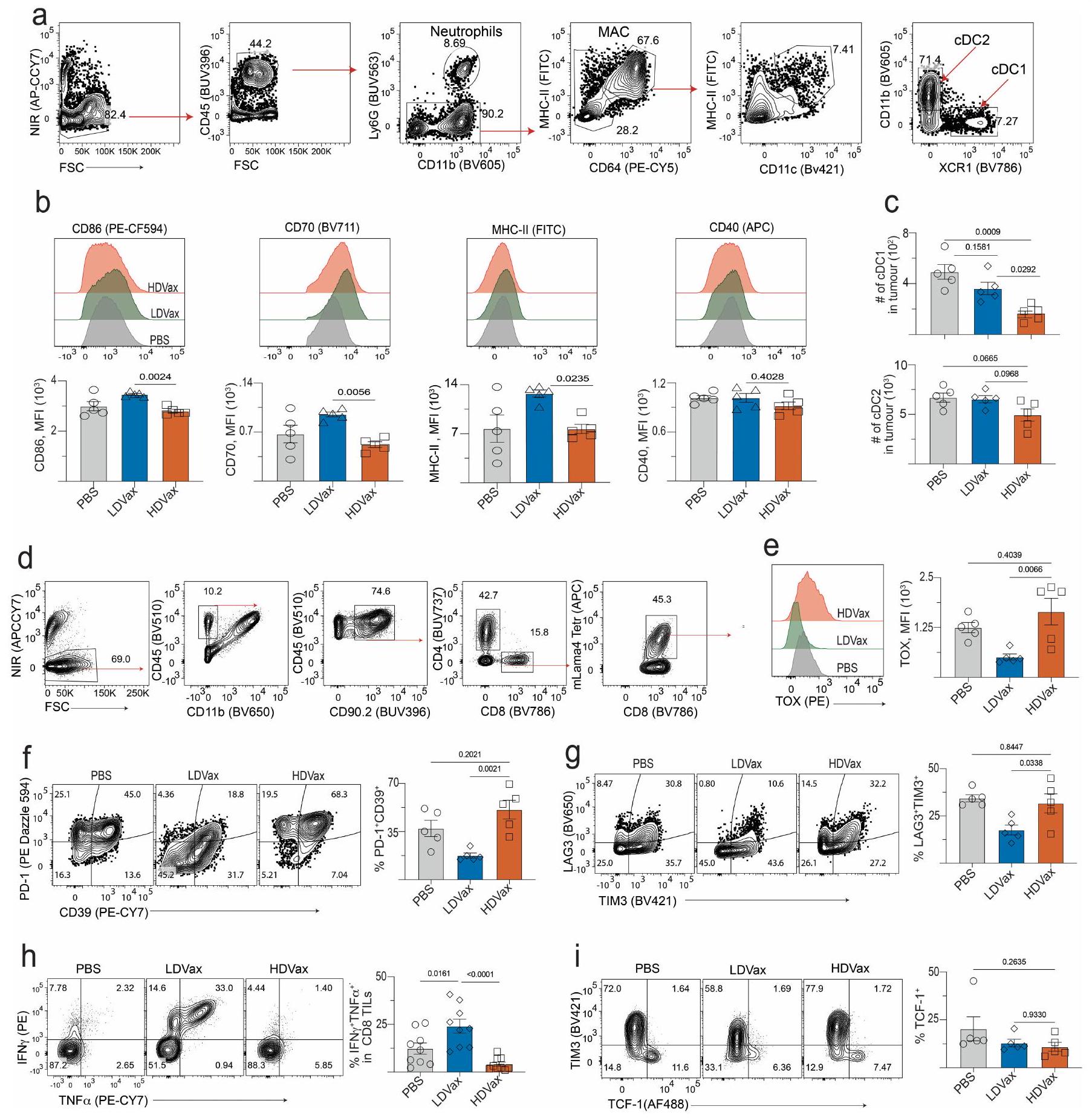 توافقًا مع الاستجابة غير الطبيعية للسيتوكينات وانخفاض استعادة خلايا cDC1 من الفئران المعالجة بـ T3-HDVax، فإن الترددات والأعداد المطلقة لخلايا CD8 المحددة لـ mLama4كانت TILs أقل بكثير من CD8تم حصاد TILs من الفئران المعالجة بـ T3-LDVax (الشكل 2f، g والشكل البياني الموسع 2d). علاوة على ذلك، CD8 المحدد لـ mLama4عبّرت TILs من الفئران المعالجة بـ T3-HDVax عن مستويات عالية من علامات الإرهاق (PD1، CD39، TIM3، LAG3 و TOX) وأنتجت كميات منخفضة من IFN. و TNF مقارنة مع مجموعات سكانية مشابهة من الفئران الحاملة للأورام المعالجة بـ T3-LDVax (الشكل البياني الموسع 2d-h). لم تُلاحظ أي اختلافات في TIM3 TCF1السكان الفرعيون (الشكل 2i من البيانات الموسعة). كشفت هذه النتائج أنه بينما ينتج T3-LDVax CD4 محدد للورمتقوم خلايا T التي تنتج مواد تعزز الاستجابة المناعية لمكافحة الأورام، حيث يحفز T3-HDVax خلايا CD4 المحددة للأورام.خلايا T التي تقلل من النشاط المضاد للورم.