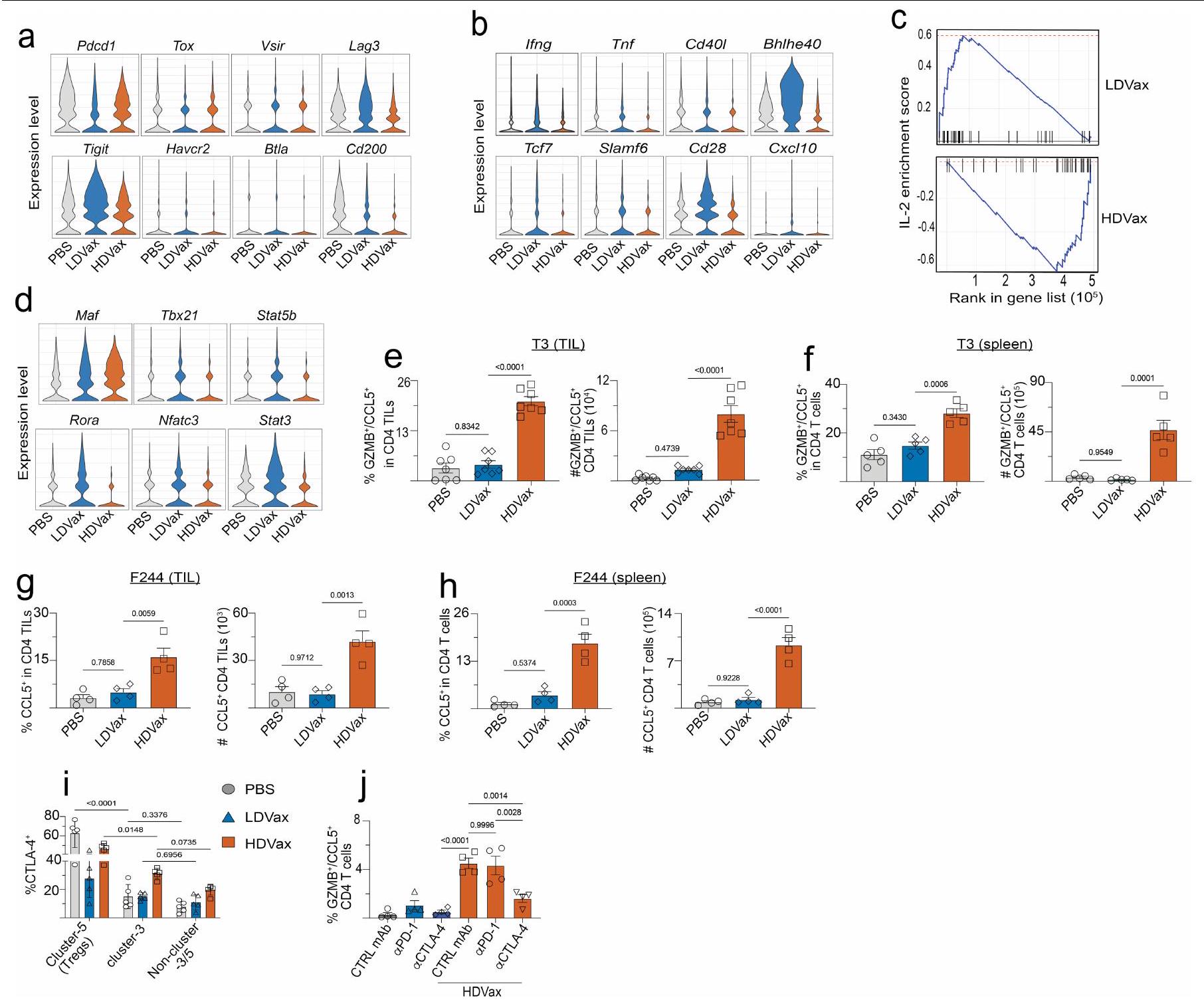كشفت التحليلات الإضافية أن T3-HDVax أدى إلى CD4تم التعبير عن TILs بمستويات مرتفعة نسبيًا من و السير النسخ الجينية ومستويات منخفضة نسبيًا من نسخ Lag3 وCd2OO وHavcr2 وTigit مقارنة بتلك التي تم تحفيزها بواسطة T3-LDVax أو PBS (الشكل البياني الممتد 3a). CD4أظهرت الخلايا التائية من الفئران المعالجة بـ T3-HDVax أيضًا مستويات أقل من mRNA لجينات Ifng وTnf وCd28 وCd4Ol وعوامل النسخ المرتبطة بالخلايا التائية المساعدة.استقطاب الخلايا، على سبيل المثال، Bhlhe4O، مقارنةً مع TILs من الفئران المعالجة بـ T3-LDVax أو الفئران المعالجة بـ PBS (الشكل البياني الممتد 3b). كما أظهر تحليل إثراء مجموعة جينات Il2 (GSEA) أن الخلايا المستحثة بواسطة HDVa أظهرت عيوبًا في توقيع IL-2 (الشكل البياني الممتد 3c)، وأعربت عن مستويات منخفضة من عوامل النسخ مثل Stat5b وRora وNfatc، وأظهرت زيادة في التعبير عن جين cMaf الذي يثبط إنتاج IL-2.مقارنة مع الخلايا المقابلة بعد علاج T3-LDVax (الشكل البياني الممتد 3d).