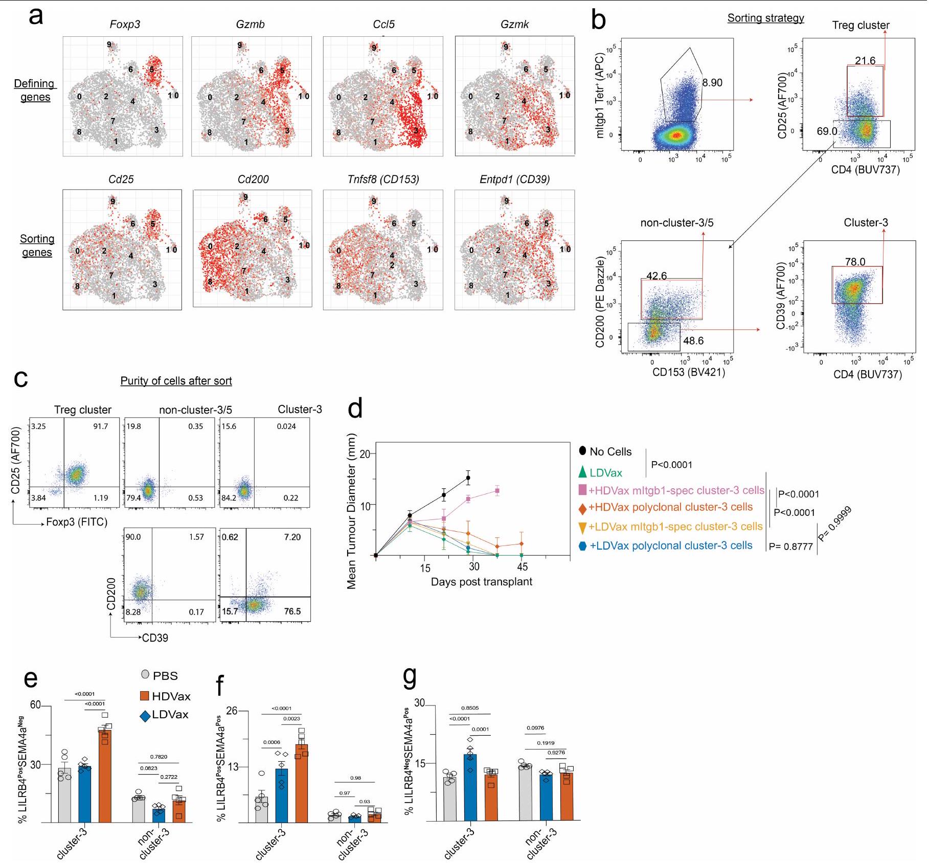 لتعريف أفضل للخلايا المثبطة للمناعة التي تشكل العنقود 3 واستخلاص رؤى حول أصولها وآلية عملها، قمنا بتعريض العنقود 3 المستخلص من HDVax، والعنقود 5 (الخلايا) وغير المجمعةتمت مقارنة تجمعات الخلايا مع تسلسل RNA العميق وقارنت النسخ الجينية لها. أكدت تحليلات مخطط البركان أن خلايا المجموعة 3 تعبر عن مستويات عالية من Gzmb و Ccl5 (الشكل 3d). لم يتم مشاركة هذه السمة من قبل خلايا أو غير متجمعة الخلايا. أظهرت خلايا المجموعة 3 المستحثة بواسطة T3-HDVax أيضًا زيادة انتقائية في التعبير عن علامتين سطحتين معروفتين بأن لهما أنشطة مثبطة للمناعة: Lilrb4 (الذي يشفر ILT3، CD85k أو gp49b)وسما4اأظهرت تحليلات تدفق الخلايا أن خلايا HDVax المجموعة 3 يمكن تقسيمها إلى أربع تحت مجموعات بناءً على التعبير الفردي أو المزدوج لبروتينات LILRB4 وSEMA4a (الشكل 3e والشكل الإضافي 4e-g). نقل الخلايا المعتمد على HDVax المحفز لـ LILRB4SEMA4aأو LILRB4سيما4CD4 المحدد لـ mItgb1تمت إزالة خلايا T بشكل مماثل لرفض ورم T3 في اختبار Rag2-/ ACT (الشكل 3f). بالمقابل، لم تقم الخلايا الإيجابية الوحيدة لـ SEMA4a أو الخلايا السلبية المزدوجة بتثبيط رفض الورم.