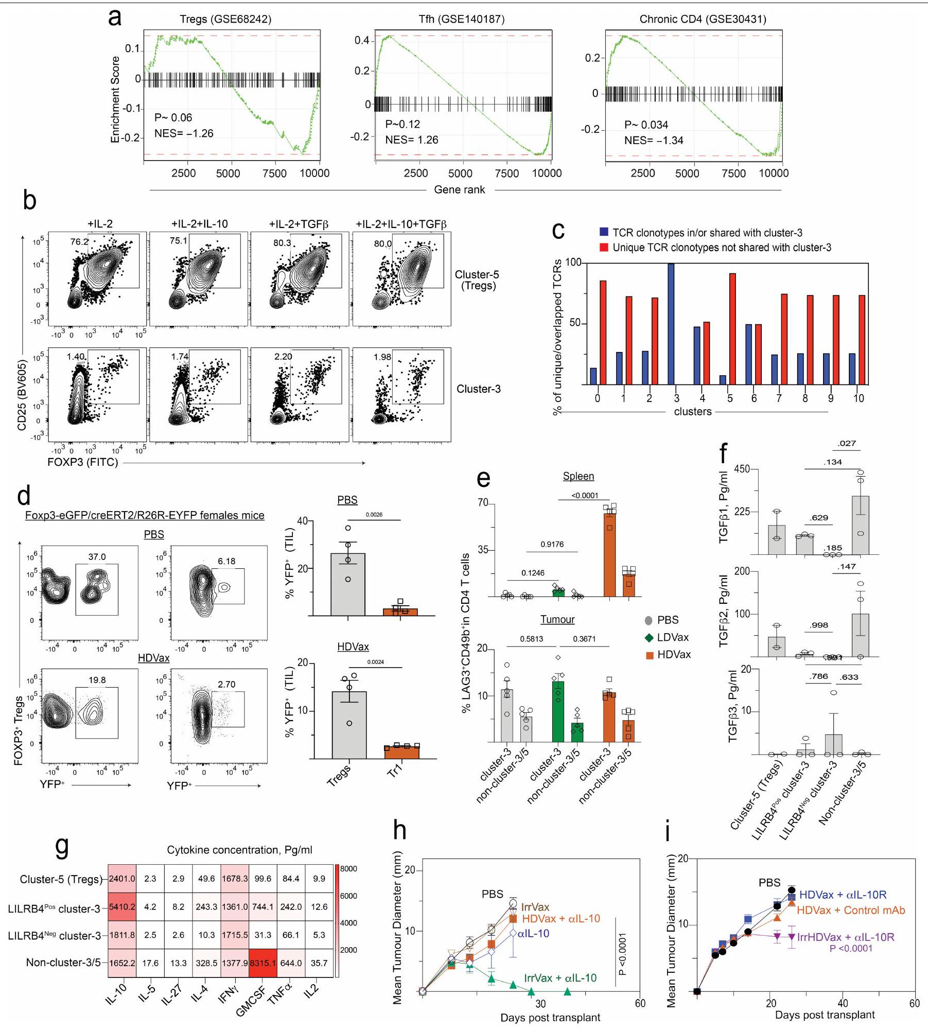 أظهر تحليل GSEA أن خلايا المجموعة 3 تعرض توقيعًا جينيًا مميزًا يميزها عن خلايا FOXP3+خلايا خلايا ومُستَنفَذ مُنبه بشكل مزمنخلايا T (الشكل البياني الموسع 5a). ظلت الخلايا المثبطة المستحثة بواسطة HDVax FOXP3بعد 10 أيام من الحضانة مع سيتوكينات مختلفة في المختبر (الشكل 5b من البيانات الموسعة). بالإضافة إلى ذلك، لم تكن الخلايا المستحثة بواسطة HDVax مشتقة منالخلايا كما يتضح من عدم وجود أنماط تكرارية مشتركة لمستقبلات الخلايا التائية في الكتلة 3 والكتلة 5 ودراسات تتبع السلالة في الجسم الحي باستخدام فئران تتبع سلالة FOXP3 (الشكل 5c,d من البيانات الموسعة). وبالتالي، لم تكن خلايا المجموعة 3 سابقة لـ، ولا متمايزة من، الخلايا. وعلى العكس، فإن توقيع الجين للخلايا في المجموعة 3 تداخل بشكل كبير مع تلك المبلغ عنها لخلايا Tr 1 في الفئران والبشر.و سامة للخلاياخلايا (الشكل 3j). بالإضافة إلى ذلك، كانت نسبة خلايا Tr1-like أعلى في المرضى الذين يظهرون مقاومة للعلاج بمضادات PD1 واللقاحات الشخصية ضد السرطان (الشكل 3k). بينما يتم استخدام تعبير LAG3 و CD49b (الذي يُستخدم أحيانًا لتعريف خلايا Tr1) لم تكن مختلفة في TILs للفئران المعالجة بـ HDVax مقارنة بالفئران المعالجة بـ LDVax، حيث كانت هذه العلامات معبرة بشكل انتقائي على CD4 المحدد بـ mItgb1.خلايا T في طحال الفئران المعالجة بـ T3-HDVax، ولكن ليس في الفئران المعالجة بـ T3-LDVax (الشكل 5e من البيانات الموسعة). LILRB4 المستحثة بواسطة T3-HDVaxخلية المجموعة 3 أنتجت كميات عالية من IL-10 وكميات منخفضة من IL-2 (علامات خلايا Tr1)، بالإضافة إلى مستويات منخفضة من TNF و GM-CSF مقارنة بـ LILRB4.خلايا العنقود 3 خلايا أو غير متجمعة الخلايا (الشكل البياني الموسع 5 ج). TGFتم إنتاجه بشكل رئيسي بواسطة غير العنقوديالخلايا والخلايا (الشكل 5f من البيانات الموسعة). لم يُنقذ حجب IL-10 باستخدام مضاد IL-10 أو مضاد IL-10R تثبيط HDVax (الشكل 5h,i من البيانات الموسعة)، مما يشير إلى أن IL-10 لم يكن كافياً لعرقلة الفعالية المضادة للورم.